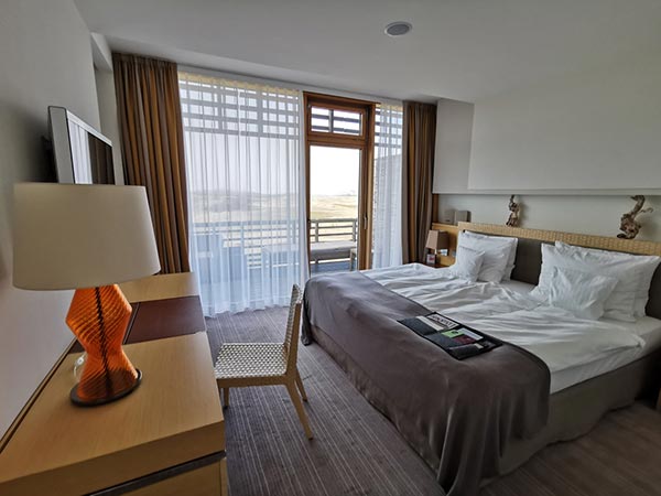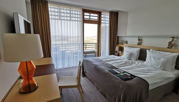 Dans la confortable et populaire chambre double de luxe (env. 35 m²) avec balcon privé, vous pourrez profiter d`une vue imprenable sans fin sur l`un des quatre points cardinaux avec vue sur la mer du Nord, le parcours de golf primé ou le Hörnum Marina.