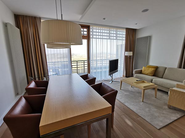 Toutes les suites offrent un salon et une chambre séparables avec un lit king-size (2,20 m) et un coussin princesse supplémentaire, la climatisation, un salon avec un coin salon spacieux et un canapé confortable avec une fonction lit, ainsi qu`un petit kitchenette (pas de plaque chauffante) et une grande table à manger.
