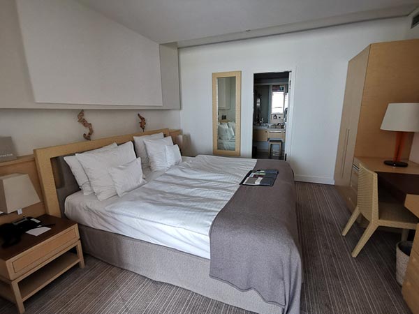 Dans nos confortables chambres doubles (env. 26 m²) avec balcon privé, vous pourrez profiter d`une vue magnifique sur la mer ou sur le parcours de golf primé à plusieurs reprises. Le salon et la chambre combinés avec des lits king ou des lits jumeaux, ainsi que la baignoire-douche ou la baignoire-douche dans la salle de bain offrent suffisamment d`espace pour se reposer et se détendre.