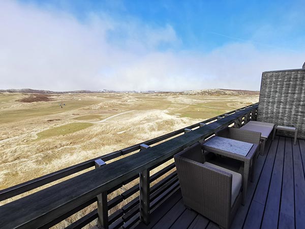 Notre restaurant Strönholt - Sylter pour épaves - offre avec son ambiance aérée et fraîche au milieu des dunes de Sylt une vue fantastique sur la mer du Nord, le parcours de golf et l`hôtel