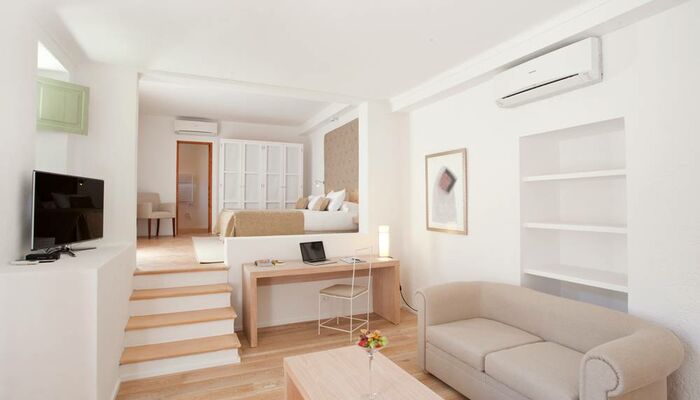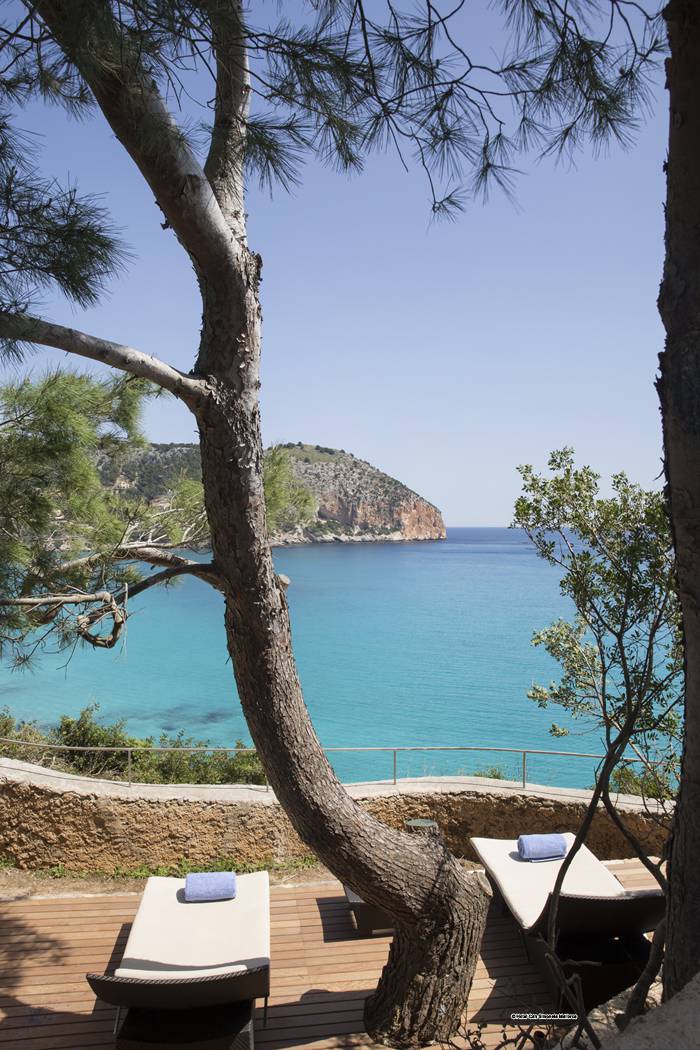 Vue sur la mer. Chaque suite junior a son style et décor individuels mais toutes suivent le concept moderne et élégant de l’hôtel Can Simoneta.