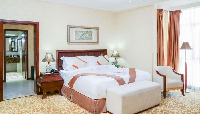 Chambre splendide et accueillante avec un lit spacieux avec un dressing indépendant. Décoré avec un design intérieur exquis et des équipements complets, un balcon privé, un jacuzzi, un accès Internet filaire et sans fil, la télévision par satellite et un mini-bar. En plus d`un salon chic et d`une salle de repos supplémentaire pour les invités.