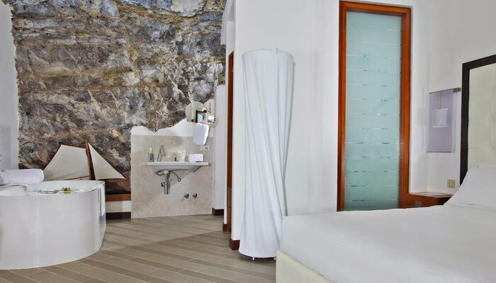 Notre hôtel est un sanctuaire, arborant une esthétique fraîche et minimaliste et une palette blanc-sur-blanc, qui soulignent les bleus du ciel et de la mer à lextérieur et les uvres dart contemporaines exposées à lintérieur. Notre philosophie du design est le chic sobre. Les détails subtils sont notre raison dêtre : nous aimons faire en sorte que tout soit impeccable, depuis les draps de coton duveteux et blancs immaculés Etro revêtant votre lit, jusquà la garniture dherbes du jardin, soigneusement disposée dans votre assiette.