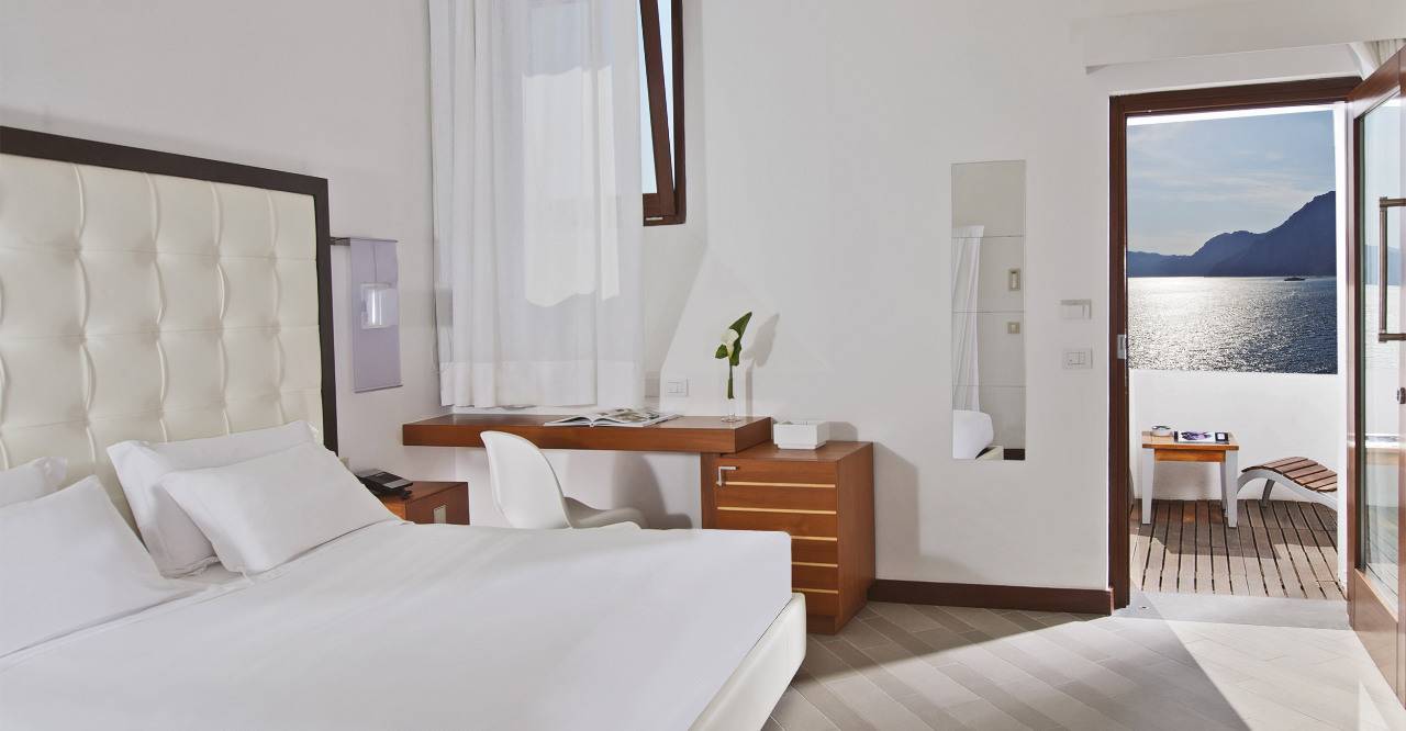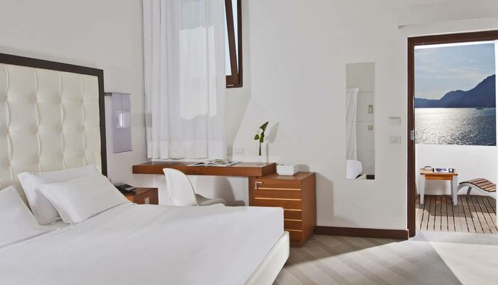 Avec une terrasse extérieure de 30 m2 accompagnant les 30 m2 despace intérieur, nos chambres Terrasse du nombre de deux seulement sont le choix parfait pour les invités qui souhaitent maximiser leur temps sous le soleil du Sud Italien. Les chambres, décorées dans le style minimaliste si particulier de la Casa Angelina, sont équipées dun lit king-size ou de lits jumeaux, ainsi que dun grand nombre daménagements, y compris une machine Nespresso, une télévision à écran plat Bang & Olufsen, une station iPod, un bureau et des panneaux électroniques tactiles pour ajuster léclairage. Les invités ont également accès à un ordinateur portable et au Wi-Fi gratuit. Comme son nom lindique, le principal attrait de ces chambres est la terrasse avec vue sur mer, meublée de chaises longues pour la farniente et dune table et de chaises pour des Spritz au coucher du soleil ou un dîner romantique.