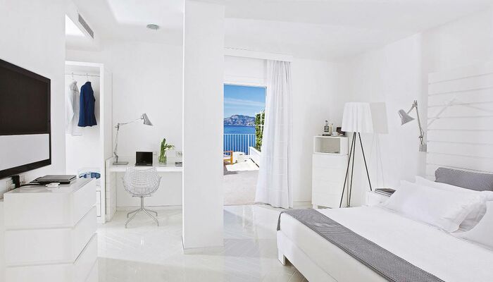La Suite Junior de 60 m2 est notre retraite la plus exclusive et la suite qui représente le mieux notre philosophie. Située au dernier étage, la Suite Junior profite de sa position élevée, offrant de superbes vues sur la mer depuis presque tous les angles de la chambre. Son intérieur tout blanc contrebalance parfaitement les couleurs vives du paysage extérieur et prête au lieu un sentiment despace et daération épurée. La suite a sa propre terrasse de 30 m2, meublée dune table, de chaises, de chaises longues et de parasols pour que les invités puissent prendre un bain de soleil ou dîner al fresco en toute intimité. La suite dispose également dune très grande salle de bain, équipée dune baignoire du designer Français Philippe Starck, ainsi que dune douche séparée. A lintérieur, vous trouverez un lit king-size généreusement proportionné, un bureau bien éclairé, une télévision à écran plat, une station iPod, un lecteur de DVD et une machine à café Nespresso. Les invités qui séjournent dans la Suite Junior auront également accès à leur propre Apple MacBook Air et au Wi-Fi gratuit pour la durée de leur séjour. Léclairage de la chambre peut être ajusté à la préférence des invités, grâce aux panneaux de contrôle tactiles simples à utiliser.