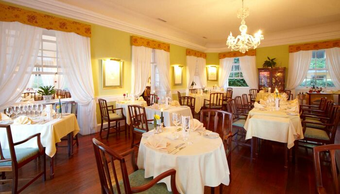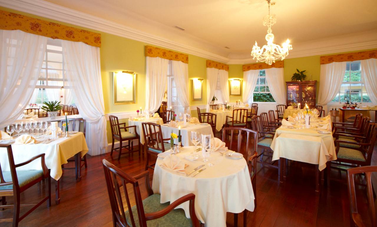 La salle de restaurant est vaste et la lumière du jour distille une lumière dorée à travers les portes-fenêtres. Le terrain de golf manucuré, avec sa belle teinte verdoyante offre une vue digne des plus luxueux établissements. La décoration est sobre, toute en élégance. Le mobilier en mahogany apportent une touche exotique au décor, avec en terrasse des tables, élégamment dressées pour dîner en extérieur.