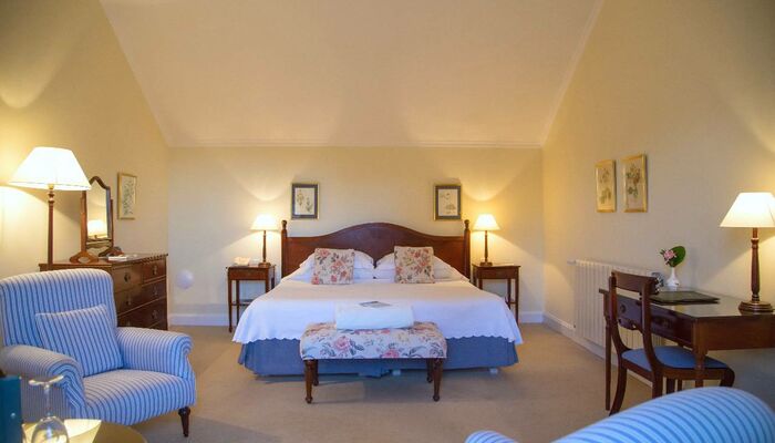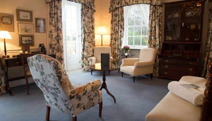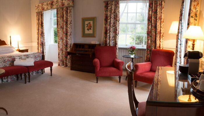Ces chambres doubles bénéficient d‘une vue privilégiée sur les jardins, elles sont situées dans l‘aile donnant sur les jardins, elle est adjacente au bâtiment principal. La vigne vierge vert émeraude apporte une touche rafraîchissante sur la pâle façade de cette aile, où les chambres du rez-de-chaussée et du premier étage, donnent sur les jardins de devant.