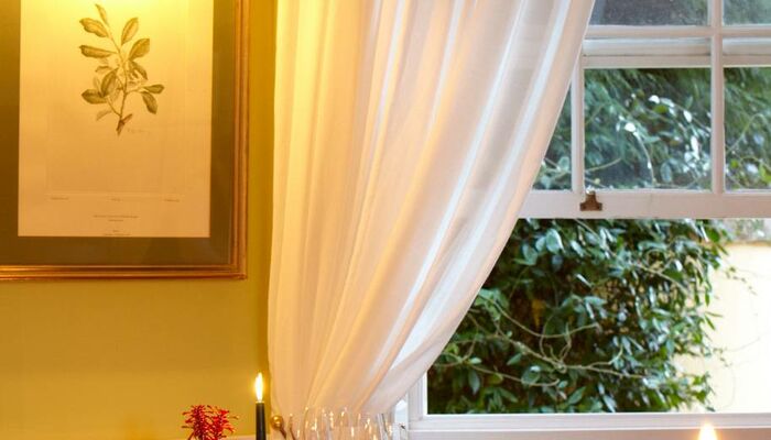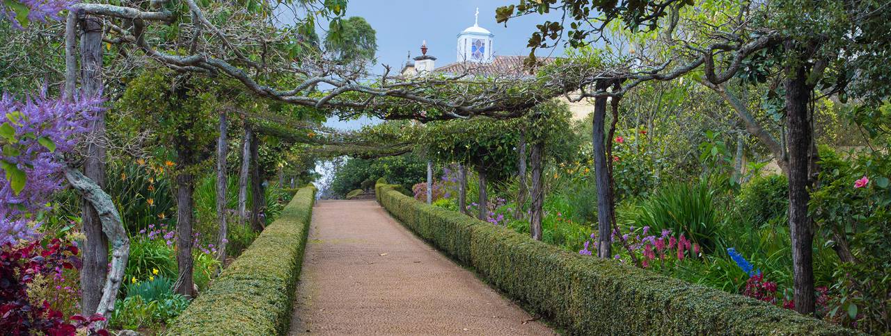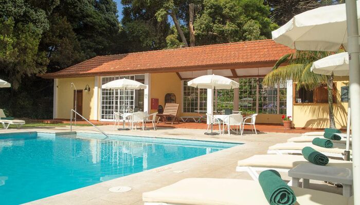 L‘élégant escalier de la demeure dessert le premier étage. Une enfilade de portes traverse la maison, reliant la bibliothèque à la salle de dessins, puis, à la salle à manger. La terrasse, en contrebas, avec en panorama, une belle pelouse anglaise parée d‘un tapis d‘oxalis mauves, nous fait rêver. Sur la droite, une seconde aile, avec d‘autres chambres. Au fond du jardin, une autre terrasse en contrebas, où évoluent poissons rouges et carpes koi dans un grand bassin. Tout ce classicisme est balayé de l‘ombre rafraîchissante d‘arbres centenaires. Au loin, un autre Metrosideros et un ravissant salon de thé ouvert aux golfeurs et amoureux de jardins. Casa Velha est un établissement raffiné, où modernité et traditions se mêlent à merveille. La salle à manger est vaste, ses planchers parfaitement cirés et ses meubles en mahogany vous rappelleront l‘époque des grands navigateurs. L‘aspect de la quinta a gardé son côté authentique malgré les réfections effectuées durant toutes ces années.