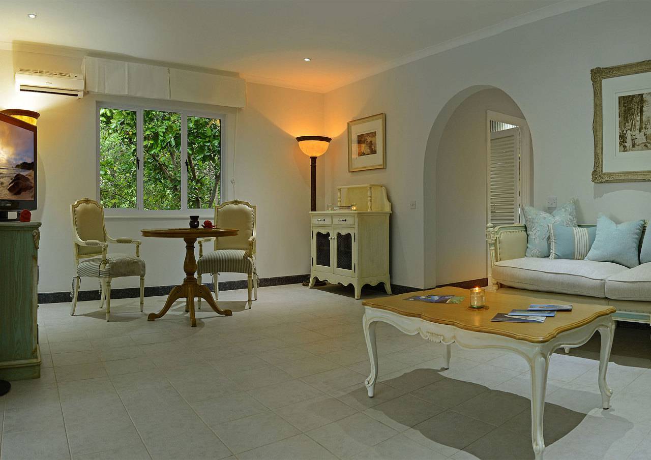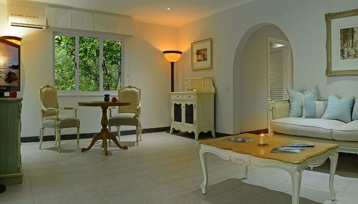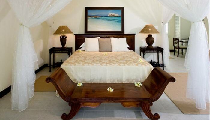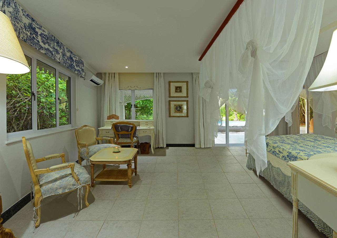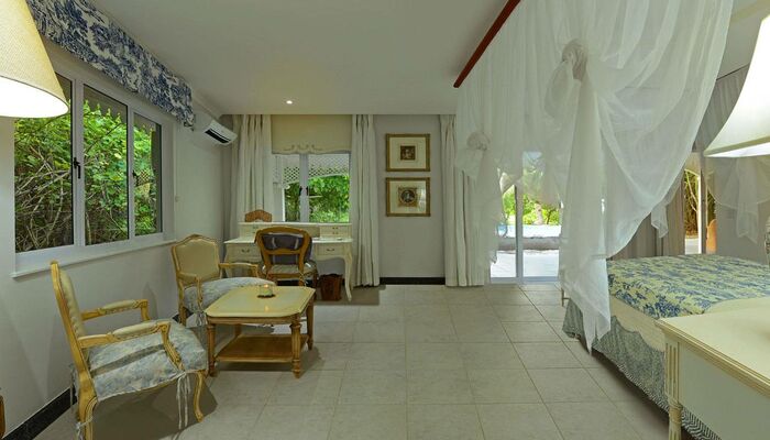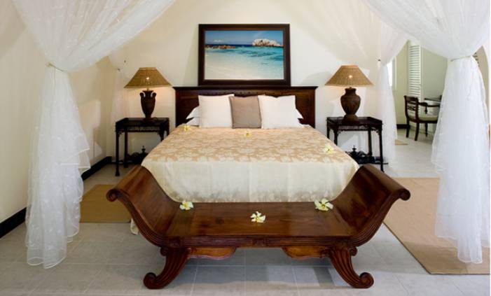 Les villas de luxe d‘inspiration coloniale française ont des réceptions donnant sur un salon ouvert et salle à manger et des chambres vastes donnant directement sur la plage angélique blanc offre des vues magnifiques sur le lever du soleil. Les salles de bains spacieuses avec salle de bains sont composées de deux douches et lavabos, baignoires jacuzzi et des toilettes fermées ainsi qu‘une véranda avant et arrière et des douches extérieures. Le prix de chaque Villa de luxe permet la capacité maximale de 2 adultes.