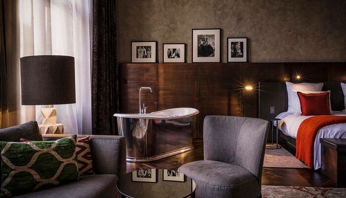 Nos grandes suites Stue offrent une hauteur sous plafond de 5 m. Elles comprennent une douche à effet pluie, une baignoire sur pieds, un espace salon confortable et un bureau. Certaines disposent également d'un balcon.