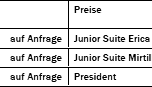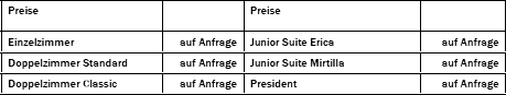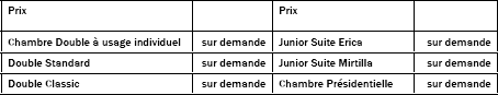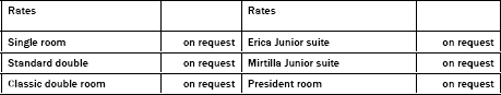 Junior Suite Mirtilla: (41 m2 + terrasse) chambre avec grand lit ou deux lits individuels, salon avec deux fauteuils convertibles, salle de bain avec douche (pour 2 personnes + 2 enfants 0/17 ans non révolus).
