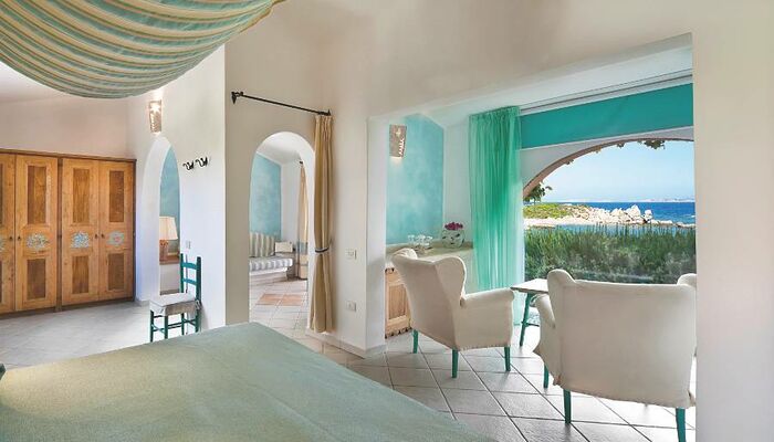 Toutes les chambres sont au rez-de-chaussée, ont une entrée indépendante et sont décorées dans un style méditerranéen; elles disposent d une terrasse couverte équipée de deux transats (ou d un salon de jardin avec deux chaises), salle de bain avec douche et sèche-cheveux, climatisation, téléphone, TV Sky, coffre-fort, mini bar, fournis serviettes de plage et peignoirs pour les adultes. Vue sur la mer avec supplément. Lit bébé gratuit à demander au moment de la réservation.