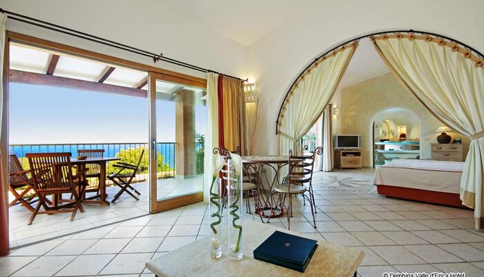 Junior Suite Erica: (35 m2 + terrasse) chambre avec grand lit double, salon avec banquette murale convertible, salle de bain avec douche (pour 2 personnes + 1 enfant 0/17 ans non révolus + 1 enfant 0/2 ans non révolus - éventuel lit bébé sur demande).