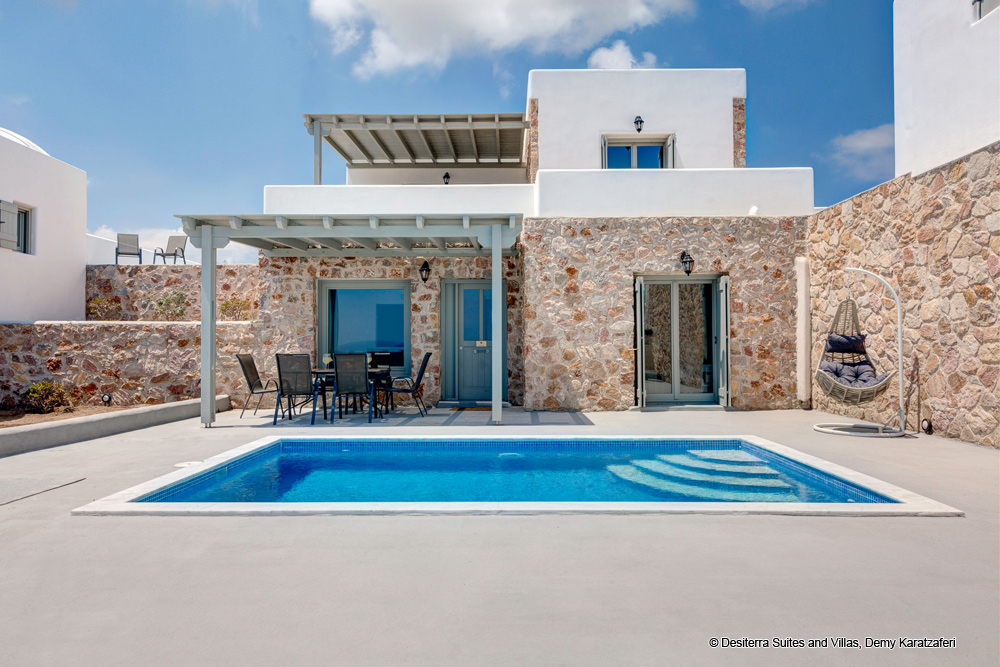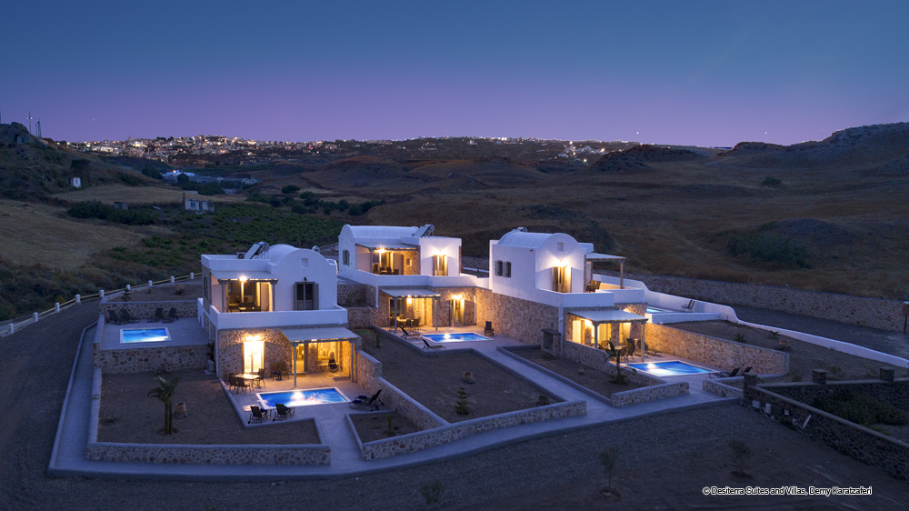 La propriété de Desiterra Suites, offre un hébergement de luxe unique à Santorin Grèce avec des services et des installations suprêmes dans un environnement serein en particulier pour ceux qui cherchent à vivre une expérience de vacances suprême. Les suites Desiterra sont des villas entièrement autonomes avec piscine privée, où nos clients ont l‘occasion de contempler le bleu profond de la mer Égée, dans une propriété de rêve bénéficiant des services les plus luxueux.