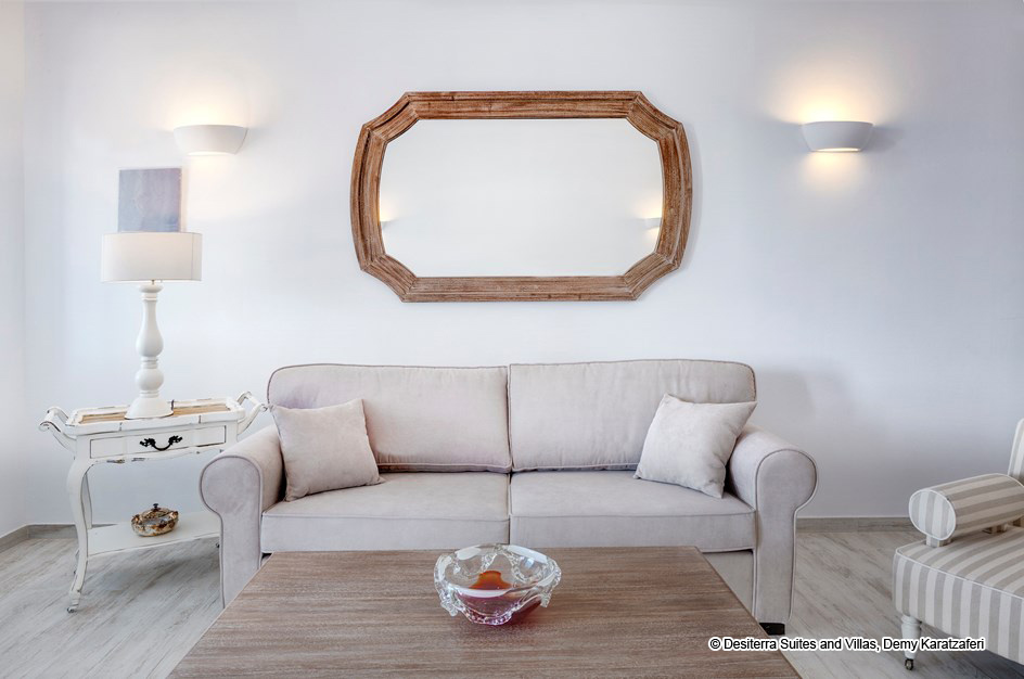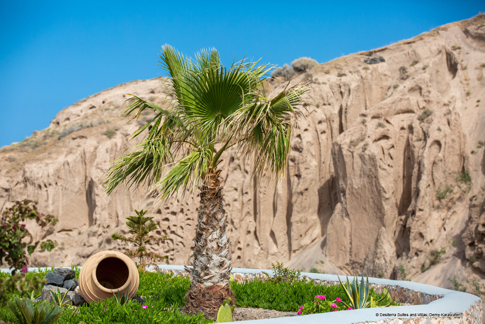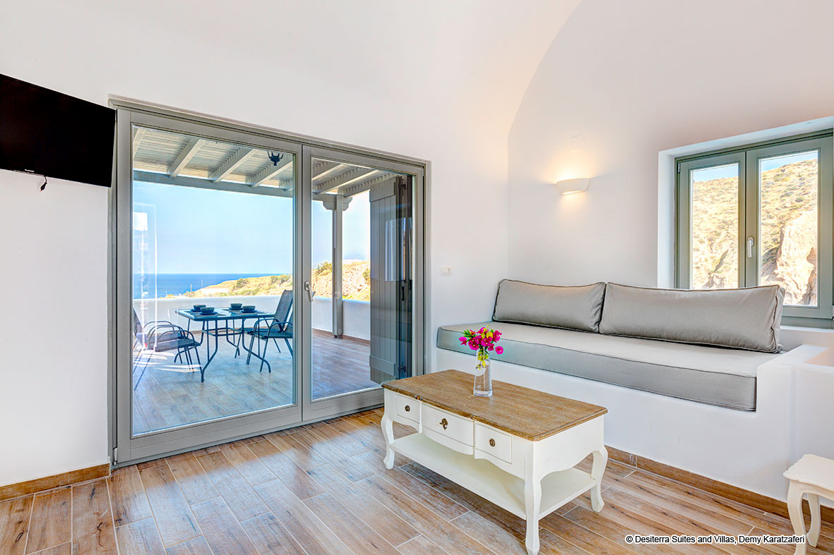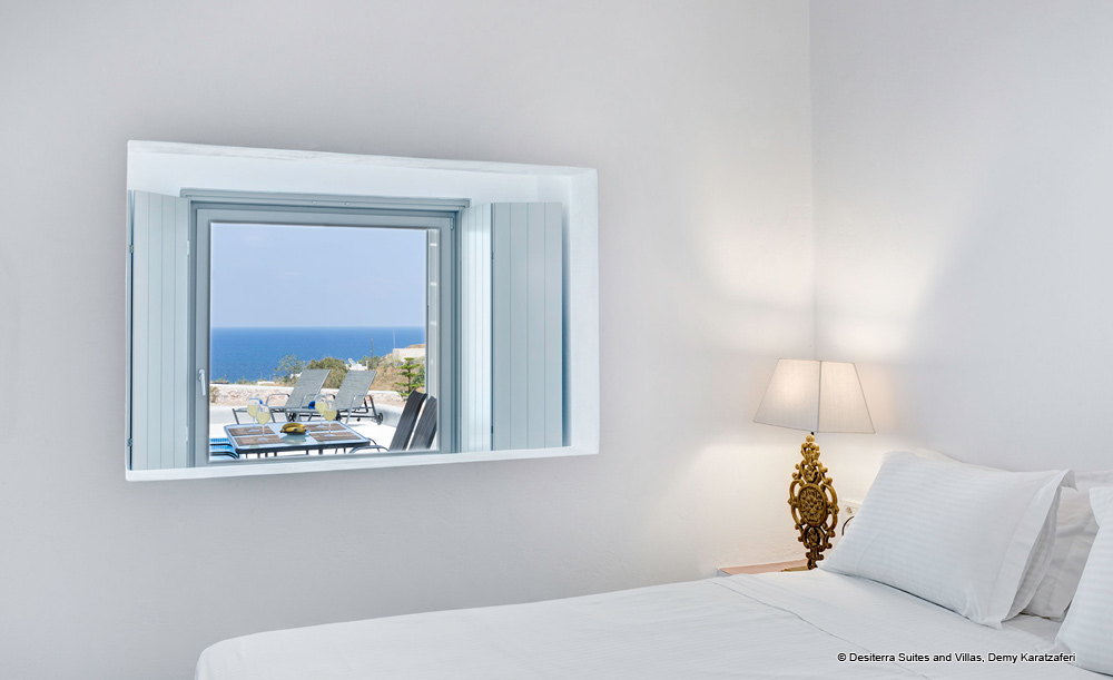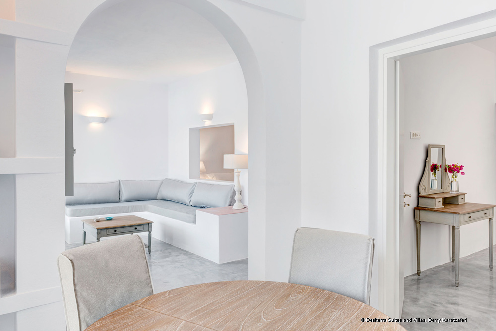 Les suites Desiterra offrent un environnement naturel unique. Les éléments naturels tels que le bois, la pierre, le verre et l‘eau bleue magique de la mer Égée, associés au soleil thérapeutique grec et à l‘énergie unique de l‘île, offrent à tous les visiteurs une véritable expérience de bien-être.