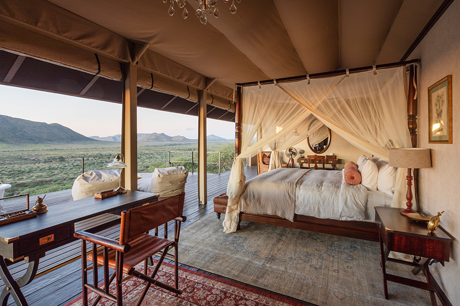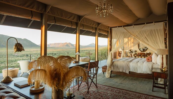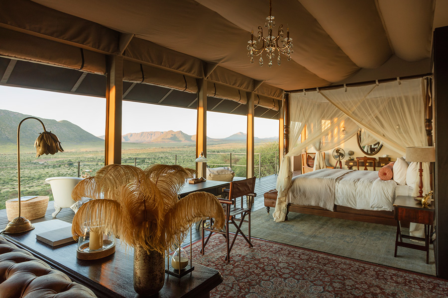 La chambre à coucher et la salle de séjour sont conçues pour se détendre et souvrir sur un salon extérieur privé et ombragé. Profitez dun coin de paradis entouré par la nature, avec une vue imprenable sur la savane, sur une surface totale de 205 m². Laissez-vous emporter par la brise en vous baignant ou en vous douchant dans la douche extérieure et la baignoire sur pattes attenantes.
