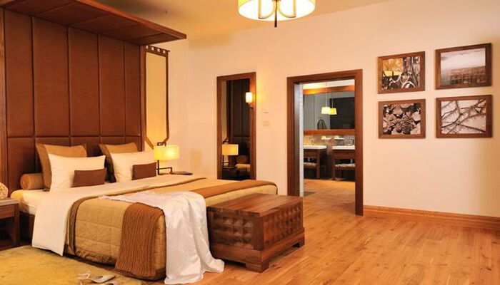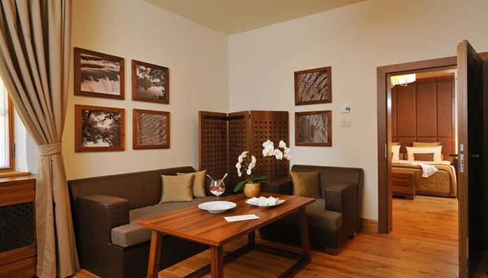 Chacune des deux suites junior donnant sur la rivière Krka de rêve et sur le parc bien aménagé comprend une chambre pour deux et un salon spacieux. Un mobilier soigneusement choisi dans des tons marron clair et en matériaux naturels crée une atmosphère apaisante et sûre. La salle de bain avec une baignoire d'angle et un bidet constitue un havre de confort après une journée bien remplie.