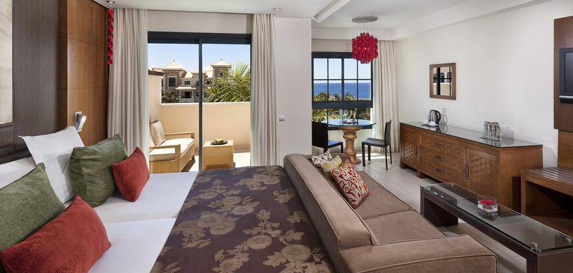 Les chambres deluxe avec vue sur mer partielle sont des chambres aux lignes élégantes décorées avec beaucoup de goût. Équipées de toutes les commodités et d`une grande gamme de services exclusifs de luxe, elles vous permettront de profiter d`un séjour unique aux Canaries. Avec une surface de 48 m2, toutes les chambres disposent d`une terrasse meublée avec vue sur l`océan Atlantique. Des espaces à vivre complètement intégrés dans l`environnement paradisiaque de Ténérife.