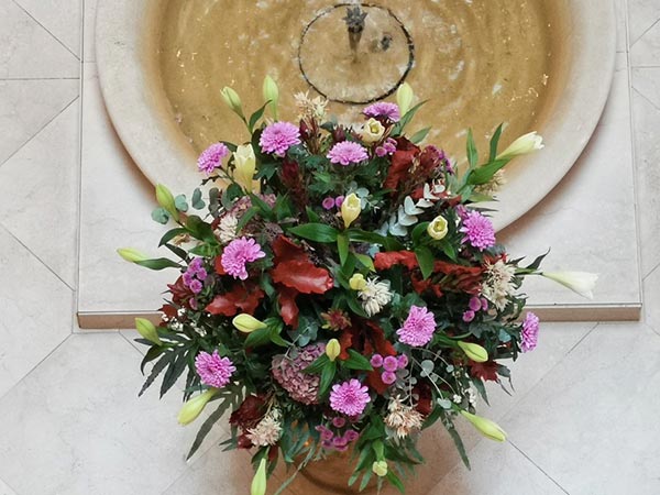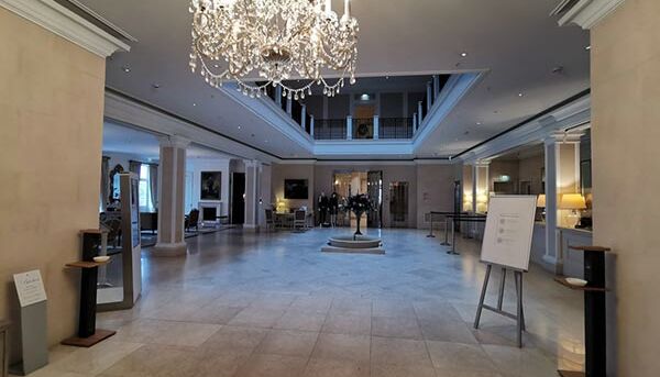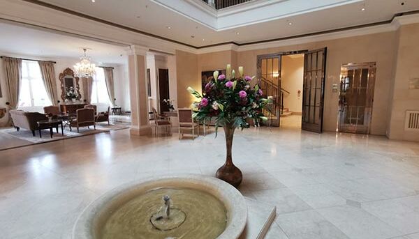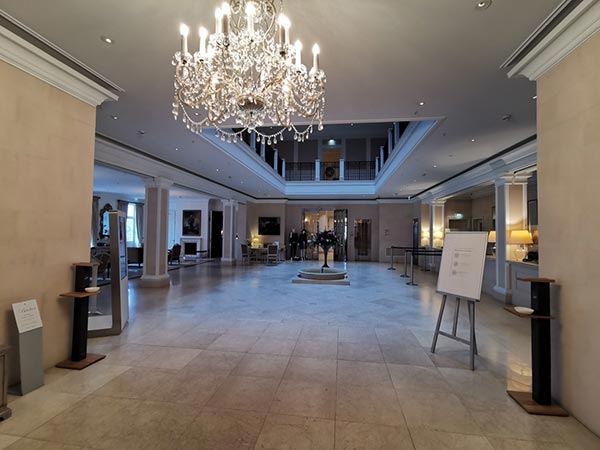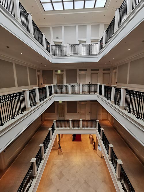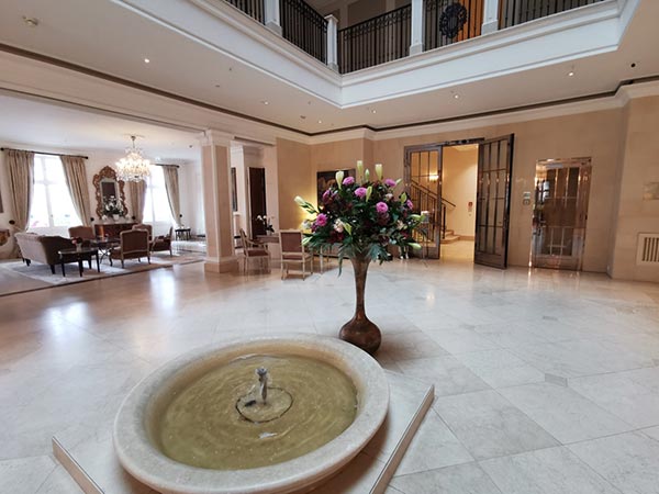 La salle de bal historique-classique avec son foyer en marbre offre un cadre magnifique pour des festivités haut de gamme, des soirées de gala, des concerts ou des présentations insolites. Le hall avec une hauteur sous plafond d`environ 9 mètres est au niveau du sol et forme le centre glamour du Kurhaus.
