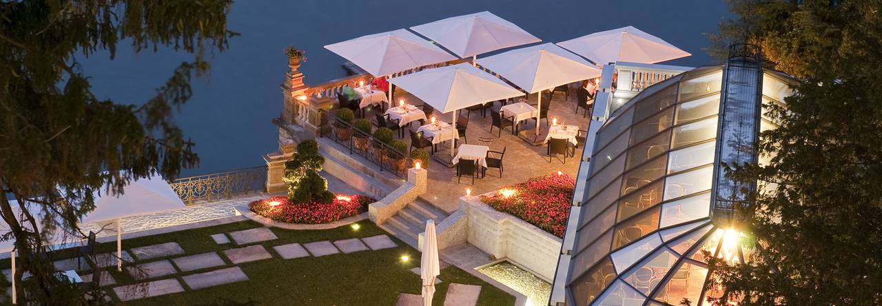 Menu gastronomique au dîner. Terrasse extérieure sur le lac ouverte de mai à septembre (selon les conditions météorologiques) pour vos repas «al fresco».