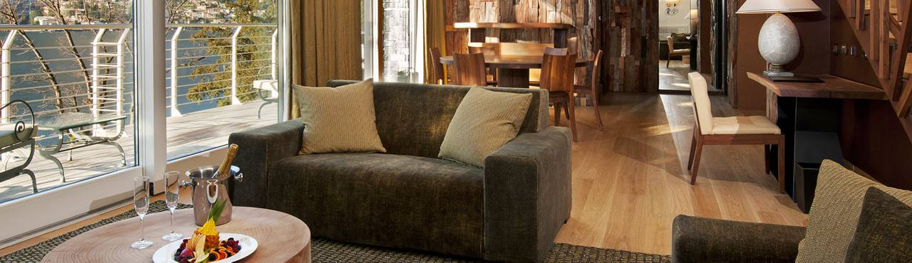 La suite Fiordiligi est composée d'un salon avec de grandes fenêtres et d'une terrasse avec une vue imprenable sur le lac, d'une cuisine ouverte avec un coin repas, de deux salles de bains et d'une chambre spacieuse et élégante.