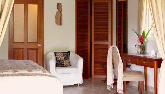 Les murs de votre Casita sont ornés d’œuvres locales, tandis que vos portes et fenêtres françaises permettent à l’intérieur de s’adapter à l’extérieur de manière transparente. La vanité de votre salle de bain est réalisée dans un beau bois franc d'Amérique centrale appelée «Poison Heart» et constitue le chef-d'œuvre d'un espace spacieux et naturellement éclairé.