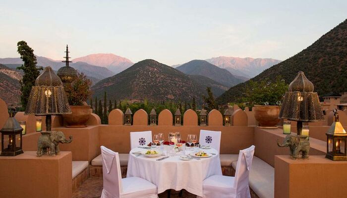 Pendant votre séjour à la Kasbah Tamadot, le dîner sera servi dans divers cadres et lieux. Si le temps le permet, dînez en plein air à côté du magnifique bar à la piscine à débordement, sur le toit-terrasse sous les étoiles ou dans un endroit privé pour deux seulement!