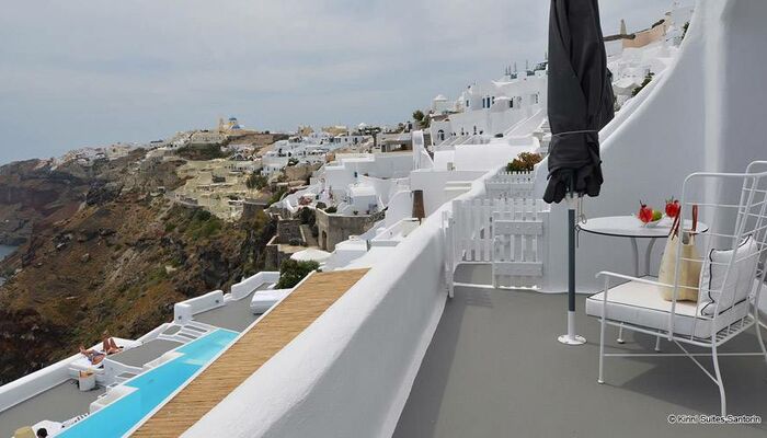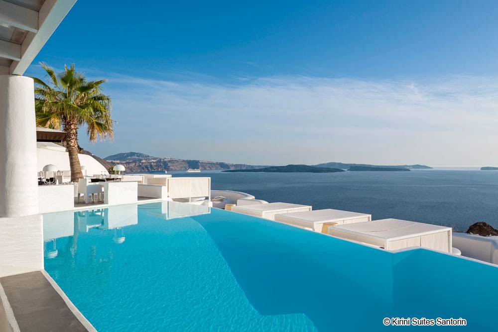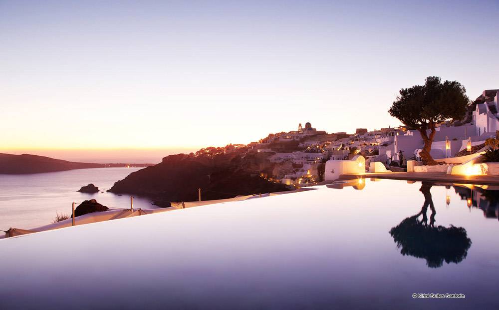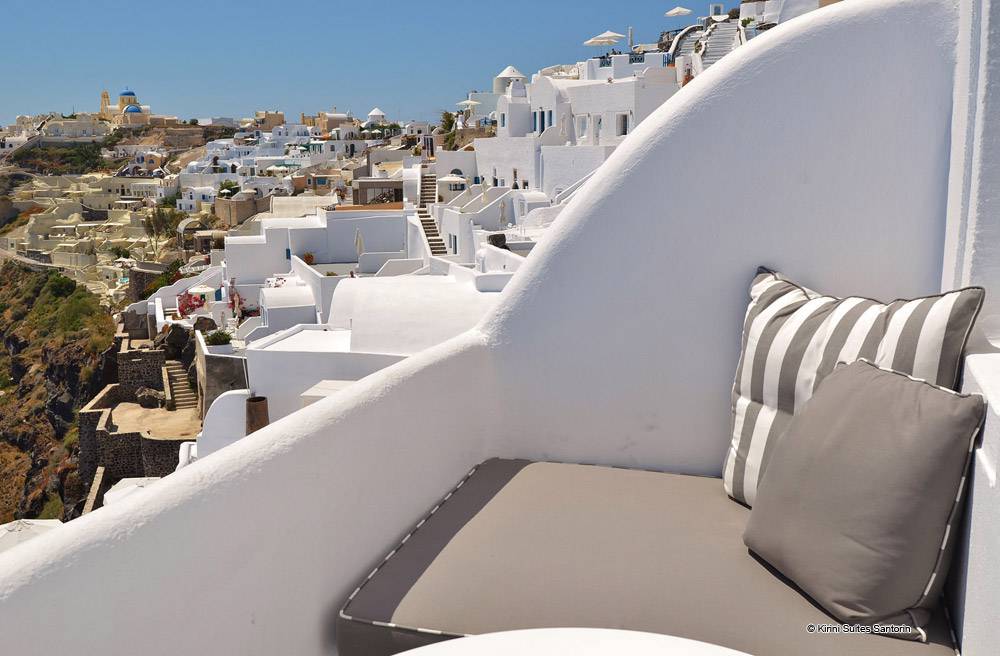 Blotti sur la falaise, l’hôtel Kirini Suites & Spa, est parfaitement situé afin que ses occupants puissent profiter de la vue majestueuse et sereine et qu’il soit facile en même temps de visiter le village féerique d’Oia. Avec un accès facile à la place principale d’Oia, les visiteurs seront subjugués par la vue de la Caldeira au soleil couchant. Tous ceux qui ont vu un coucher de soleil sur l’île de Santorin considèrent que c’est un spectacle inoubliable.