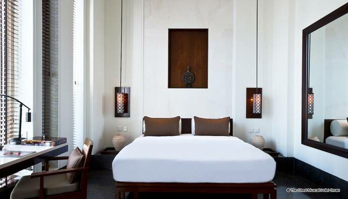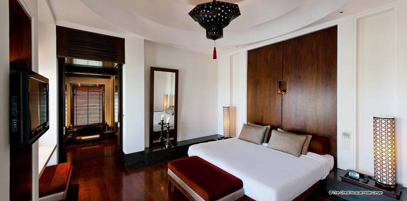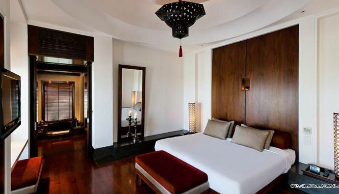 Chacune des 156 chambres et suites exquises offre un accès exclusif aux piscines turquoise avec des cabanes confortables, un jardin aquatique et une plage privée. Le décor présente une élégance simple d'inspiration asiatique dans le style GHM avec des caractéristiques distinctives et des touches subtiles de couleurs vives caractéristiques de l'architecture traditionnelle omanaise, qui confèrent un charme immuable et un sens distinct du lieu. .