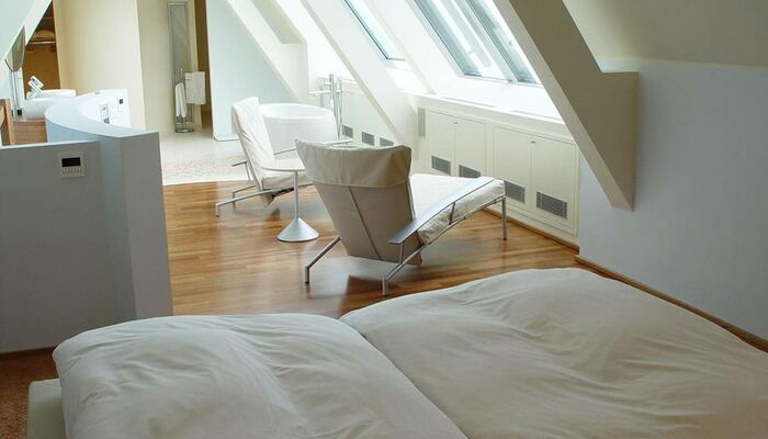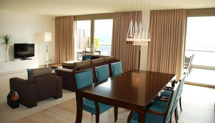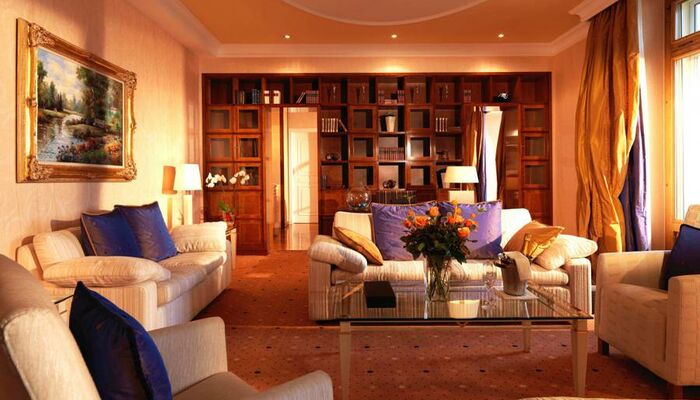 Suite Royal avec vue sur le lac: Après vous être confortablement prélassé dans la salle de bains en marbre sculpté, vous pourrez observer à travers les baies vitrées les couleurs des Alpes, variant au fil des saisons et accentuant les couleurs douces des murs de votre salon. Lors d`un dîner entre amis, profitez de la rafraichissante brise du lac qui souffle sur votre jardin d`hiver. Superficie : 185 - 250 m² avec jardin d`hiver et balcon privé