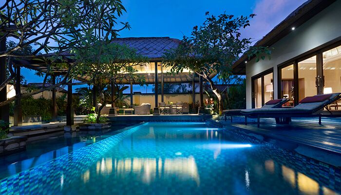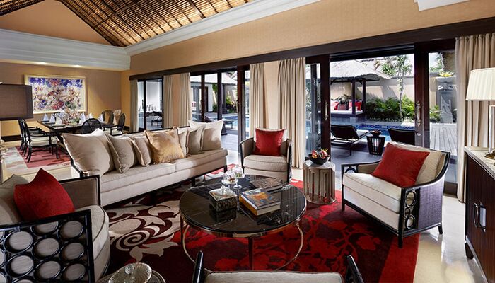 La villa présidentielle de trois chambres nichée au cœur du Trans Resort Bali, pittoresque une oasis tranquille. Une piscine de taille généreuse se trouve au milieu de son espace de 700 m² où les couleurs primitives accentuent le cadre idéal d`un paradis balinais.