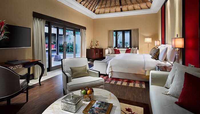 Les espaces de vie et de couchage séparés permettent à ces suites de répondre de manière luxueuse aux besoins des vacanciers. Le salon possède son propre balcon avec accès direct à une piscine privée et un jacuzzi et est parfait pour se divertir avec une table à manger pour quatre, des canapés moelleux et des fauteuils confortables, ainsi qu`une grande télévision à écran plat. Une porte en bois assure efficacement l`intimité de la chambre et une magnifique fenêtre sculptée balinaise s`ouvrant sur la salle de bain avec douche à effet pluie et toilettes à distance. Un hébergement supplémentaire peut être ajouté en se connectant à une chambre lits jumeaux Premier.