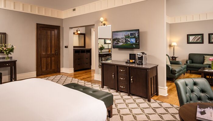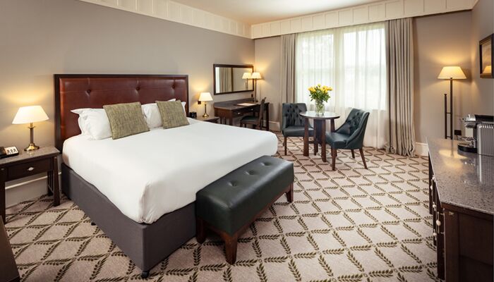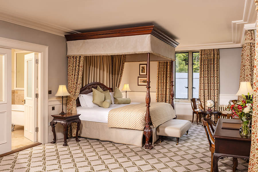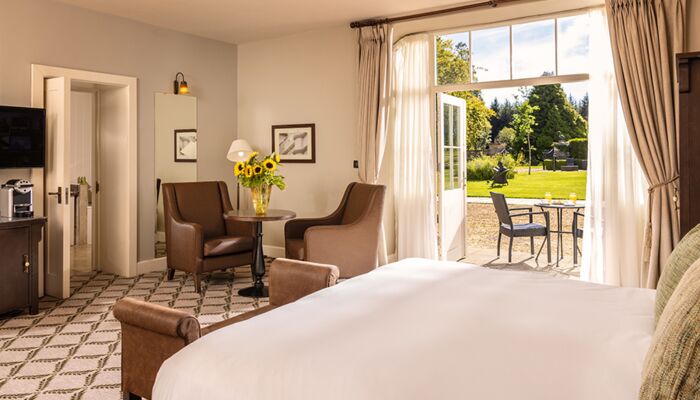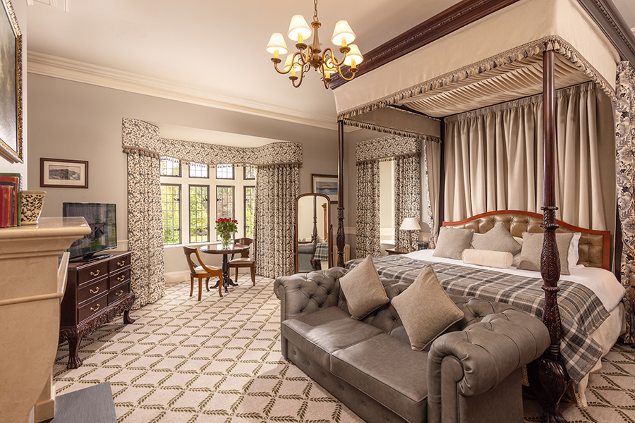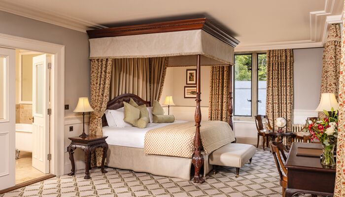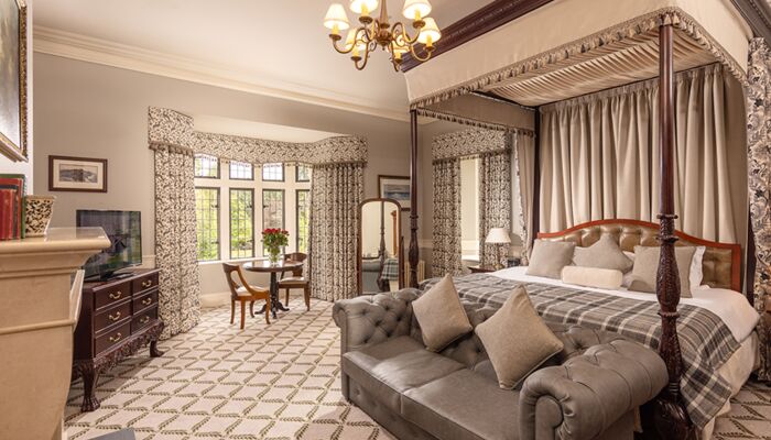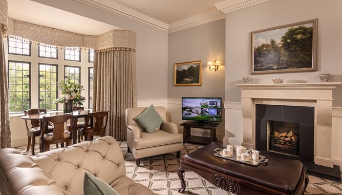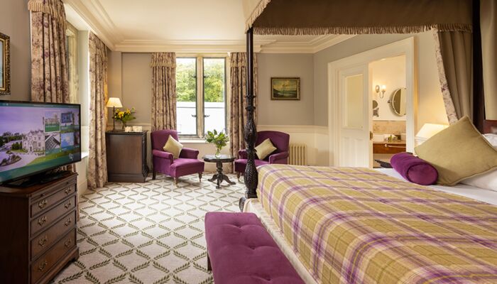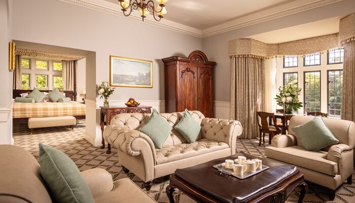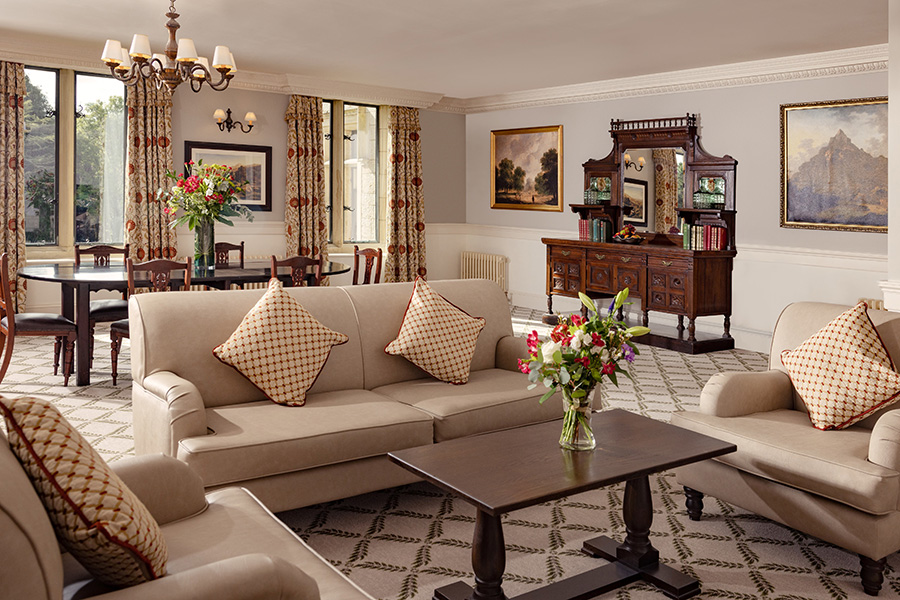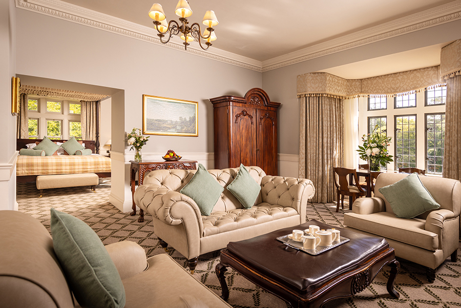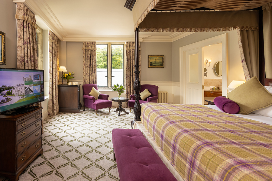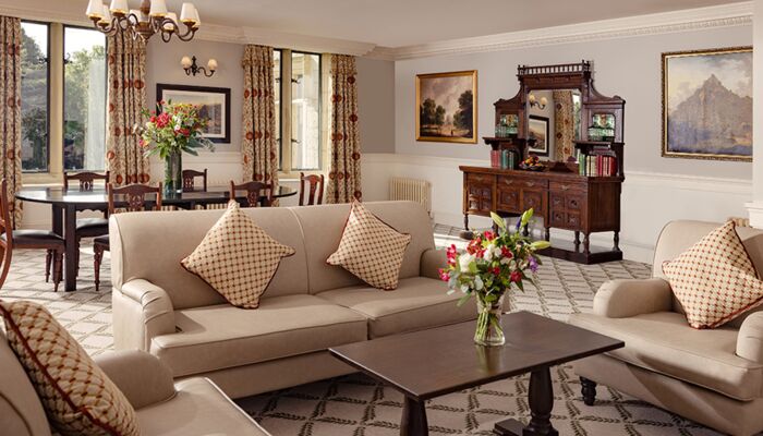 Cette magnifique suite comprend 2 chambres avec salle de bains privative et un salon spacieux avec des portes de séparation totalisant 181 mètres carrés. La suite présidentielle offre également un accès privé à la tour du château. Il y a des meubles d`époque dans toute la suite et chaque chambre a un lit à baldaquin en acajou sculpté à la main, des fauteuils et des tables recouverts de velours de style irlandais. Les fenêtres plombées, les feux à ciel ouvert, les foyers en pierre naturelle, les riches tapis et les couleurs vives reflètent le passé historique de ces salles de châteaux pleines d’atmosphère qui offrent une vue imprenable sur les terres et les bois environnants. Un monde d`élégance décontractée est offert avec le luxe moderne, comme la connectivité WiFi, les téléviseurs à écran plat, les prises à double tension et un coffre-fort à serrure numérique.