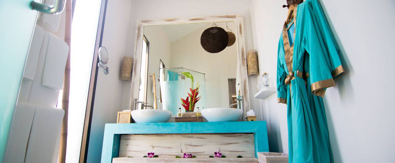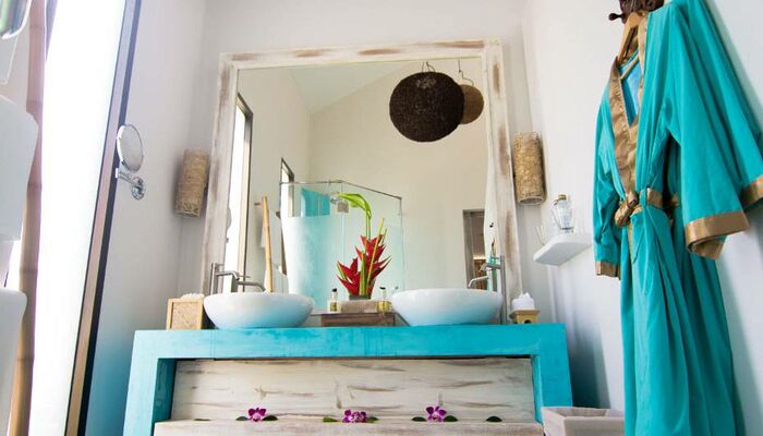 Les chambres de luxe de cette station de Phang Nga disposent d‘un espace habitable de 45 mètres carrés et de la salle de bain ouverte avec baignoire et douche séparées.