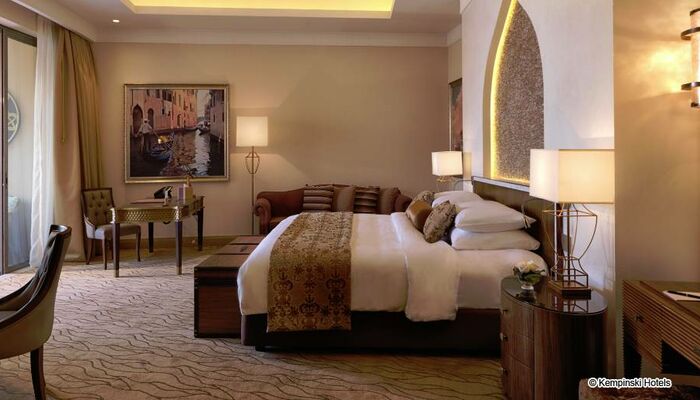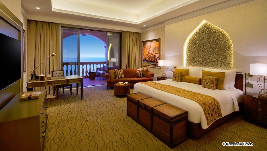 Toutes les chambres de luxe - Vue sur la mer donnent sur les eaux azores du golfe arabe entourant l‘île privée de Marsa Malaz Kempinski. Les chambres de luxe - Vue sur la mer sont conçues pour une détente et un confort inégalés, offrant un lit King ou un lit jumeau ainsi que des espaces extérieurs spacieux (balcon / terrasse). La palette sereine de couleurs chaudes dans les tissus et les tapisserie d‘ameublement offre un environnement relaxant et ambiant. La salle offre un espace inégalé, y compris la zone extérieure, de 75.