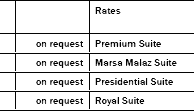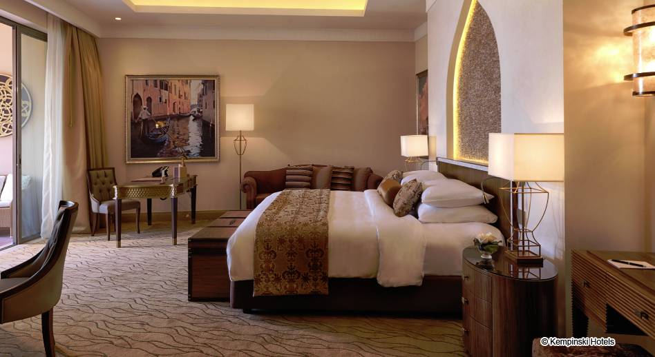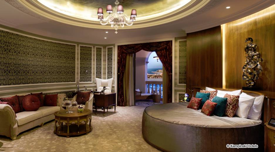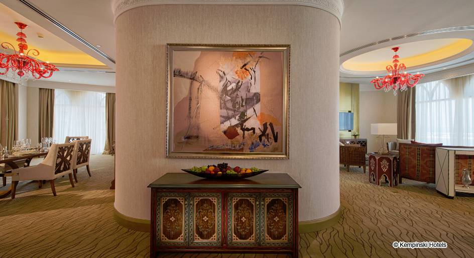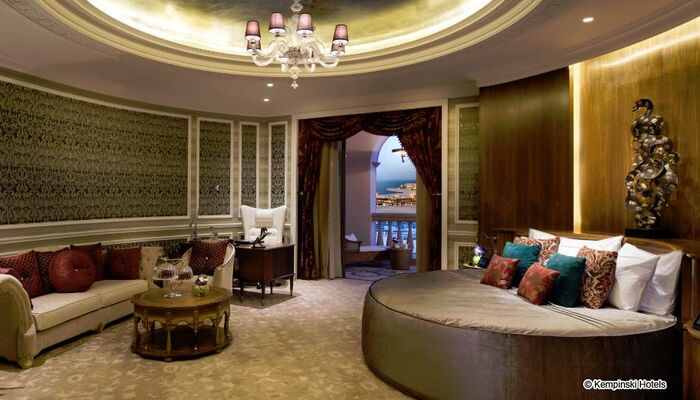 Les 281 chambres luxueuses de Marsa Malaz Kempinski - dont 69 suites, deux suites présidentielles et deux suites royales - fournissent la technologie la plus récente, avec le service de votre restauration privée de majordome à tous vos besoins, les 24 heures par jour. En outre, l‘hôtel dispose également d‘une plage isolée située dans une baie privée avec des piscines extérieures, des installations de sports nautiques, des embarcations de yachts, des courts de tennis et des jardins luxuriants et des patios permettant aux clients de se détendre dans un cadre luxueux de la station.