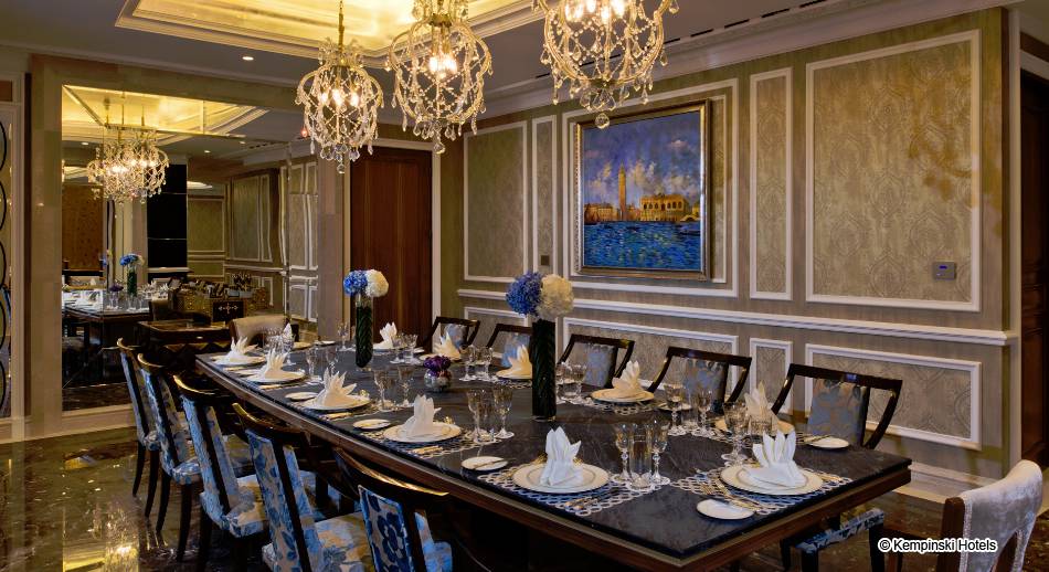 Marsa Malaz Kempinski se prête parfaitement aux évènements et réunions d‘entreprise, aux occasions festives ou aux soirées privées et d‘entreprise, soit à une échelle plus ou moins grande. La destination offre une gamme impressionnante d‘installations de réunion et de conférence à Doha avec le Palazzo Ballroom, la salle de bal Venezia et six salles de réunion individuelles avec une entrée dédiée au rez-de-chaussée inférieur. Le lieu le plus spectaculaire est le Palazzo Ballroom de 1 100 m² (11 538 pieds carrés), qui comprend sa propre suite VIP individuelle attenante, qui offre discrétion et confidentialité, si nécessaire.