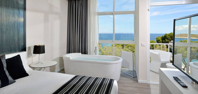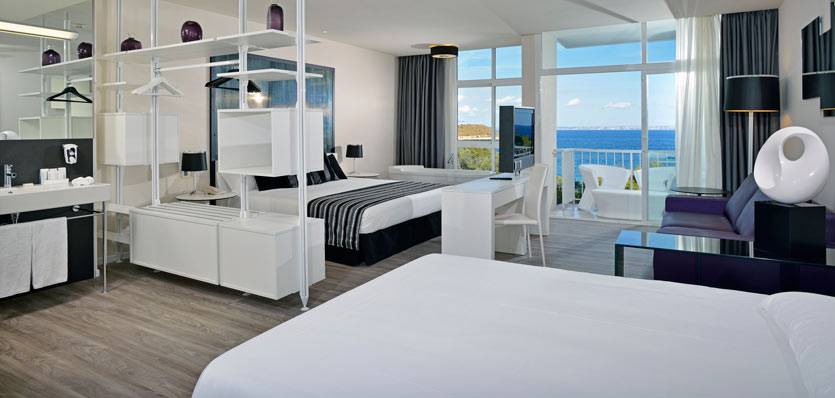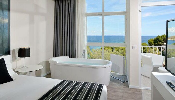 Située aux étages supérieurs, la chambre Meliá avec vue frontale sur la mer permet de profiter d'une vue spectaculaire sur la Méditerranée. Son intérieur épuré et minimaliste, avec ses grandes fenêtres du sol au plafond, crée un environnement lumineux et suggestif.
