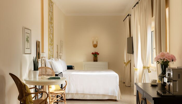 Terrasse avec Vue Mer - Bâtiments Visconti & Réception ; située dans le parc – Bâtiments Visconti & Réception – avec une petite terrasse et vue mer – Un lit double. Chaque chambre dispose d`un mobilier et de couleurs coordonnés, d`une armoire intégrée, d`une table, de 2 téléphones (dont un dans la salle de bain), d`une télévision par satellite, d`un minibar, d`une salle de bain avec lavabo en marbre, bidet, baignoire, sèche-cheveux et miroir de maquillage. Air conditionné. Coffre-fort dans la chambre.