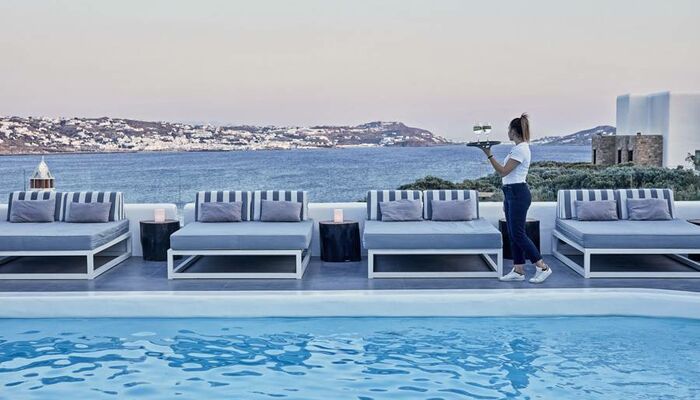 Pendant les jours ensoleillés au bord de la piscine. Offrez-vous des cocktails de fruits frais, des boissons fraîches et des collations délectables. Parcourez le menu des hamburgers gastronomiques, des salades, des pizzas et des desserts indulgents. Ne manquez pas un moment au soleil en vous prélassant dans l’atmosphère de détente au bord de la piscine. Cet hôtel de luxe à Mykonos propose des soins en bord de piscine. Notre personnel est à votre disposition pour vous préparer des collations, des rafraîchissements ou tout simplement tout ce que vous souhaitez. Avec un choix délicieux, le bar de la piscine offre la solution idéale pour vous aider à vous détendre ...