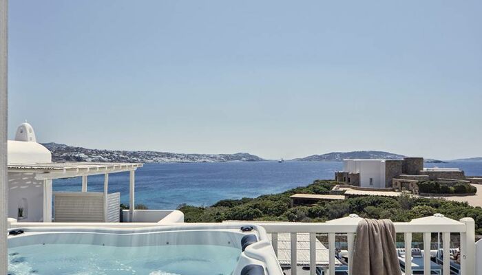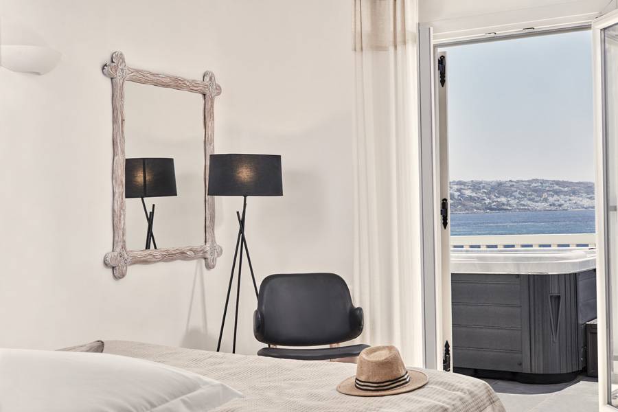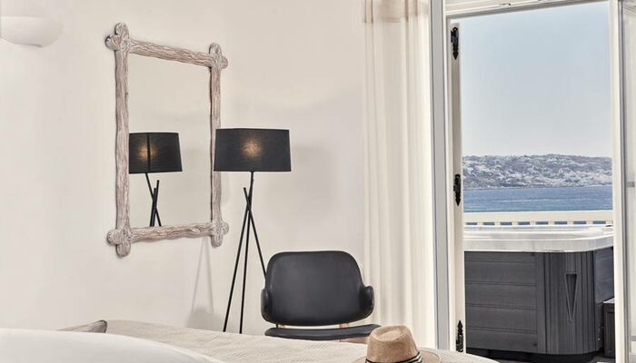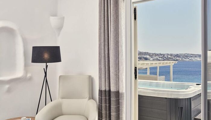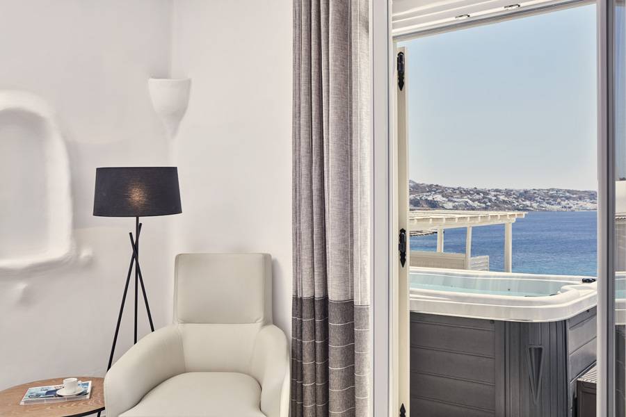 Nos suites de luxe avec vue sur la mer, d‘env. Chaque suite de luxe comprend entre 40 et 45 m² de luxueuses suites comprenant une chambre, un salon spacieux et une salle de bains au design unique avec douche. Ils peuvent accueillir jusqu‘à trois personnes, tandis que des lignes épurées et une palette terrestre élégante vous enveloppent dans le luxe contemporain opulent. Ces suites disposent d‘une véranda avec un jacuzzi extérieur privé où vous pourrez vous détendre et profiter de la vue imprenable sur la mer Égée. Profitez de la vie à Mykonos Princess Hotel de la plus belle manière.