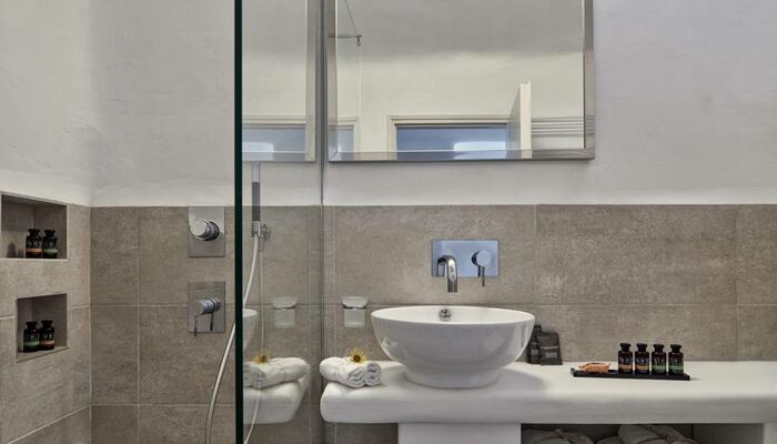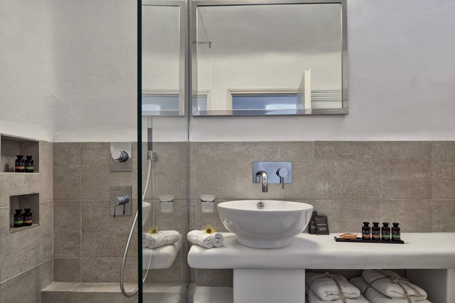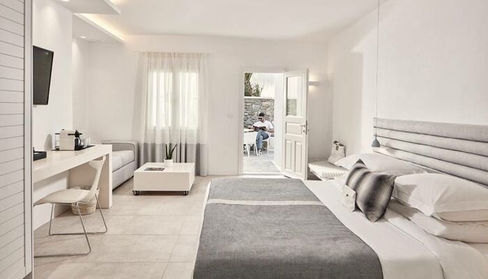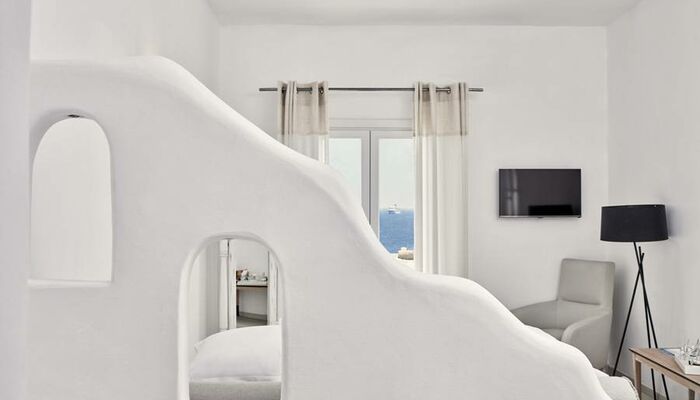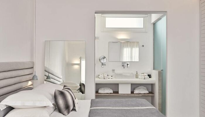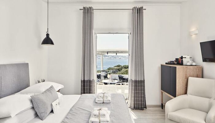 Les chambres doubles supérieures modernes sont aménagées de manière unique et inspirées par la tradition et l’architecture de l’île. Les chambres sont une fusion de confort et de vie décontractée, tout en offrant une vue directe sur la mer Égée. À environ 24-28 m² jusqu’à deux personnes peuvent être logés dans ses locaux. Dans la pièce, une lumière du jour abondante et une palette de couleurs douces - combinées à un design minimaliste - vous transportent dans votre propre coin de paradis.