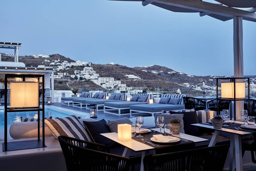 Le Sky Lounge, situé à l‘étage supérieur du Mykonos Princess, offre une vue imprenable et des boissons de qualité. Il propose une terrasse extérieure avec seulement six tables à disposition. L‘endroit idéal pour se détendre tout au long de la journée, que vous choisissiez le petit-déjeuner, des cocktails et du vin ou un délicieux dîner après le coucher du soleil. Profitez de déjeuners et dîners mémorables dans notre exceptionnel salon Sky, tout en admirant les 180 vues panoramiques sur la mer Égée et la ville de Mykonos. Ouvert de 13h00 à 23h00