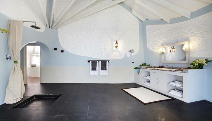 Les 120 m² Sultan Suite est également idéal pour les familles. Il dispose de deux entrées séparées, de deux chambres doubles, de deux salles de bain et d'un grand salon avec canapé-lit, avec accès direct à la plage privée, équipée d'un jacuzzi, d'une balançoire, d'une douche extérieure, de chaises longues et de transats.