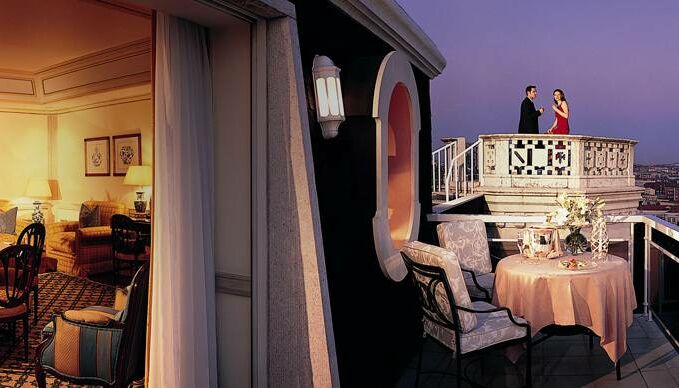 Situé dans le palais d‘origine au 5ème étage. Décoration de style 19ème siècle avec grand salon séparé et belle terrasse donnant sur jardin, rivière et ville. Lit king et espace de rangement séparé. Peut être converti en une suite de deux ou trois chambres. Grandes salles de bains en marbre avec double vasque, jacuzzi et douche séparée. Environ 145 m² / 1560 pc.