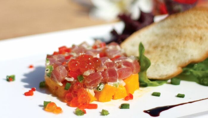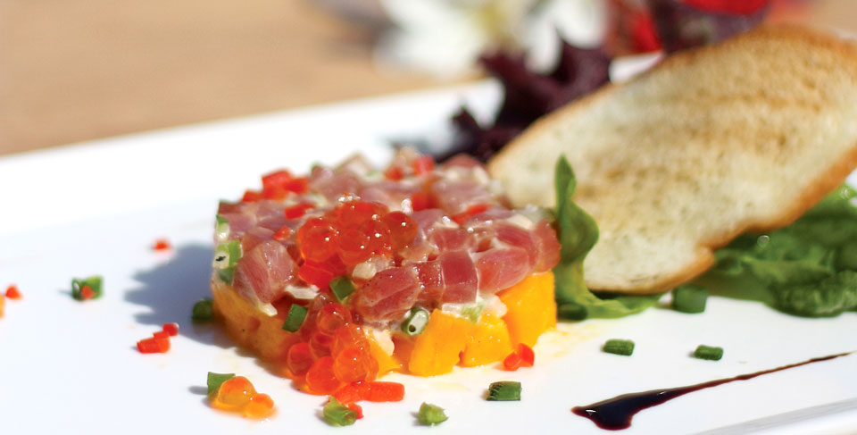 Le plaisir du Petit Saint Vincent: Le tartare de thon jaune, le cantaloup et le caviar de saumon - un délicat mélange d‘herbes fraîches, d‘épices et de fruits de mer locaux, inspiré de la mer. Avec deux restaurants, une colline et une plage, nos chefs gastronomiques proposent une variété de cuisine créative inspirée par les fruits de mer localement capturés et nos fruits et légumes organiques cultivés dans l‘île. Pendant le coucher du soleil, les barbecues de plage hebdomadaires avec une excellente musique locale font un dîner romantique sous le ciel étoilé. Profitez de bons restaurants dans notre confortable restaurant principal surplombant le port. Ce n‘est pas difficile à manquer. Si vous suivez le long escalier en pierre courbé (bordé par un beau feuillage tropical et des lanternes suspendues) au sommet, vous trouverez le restaurant et bar élégant en plein air au Pavilion.