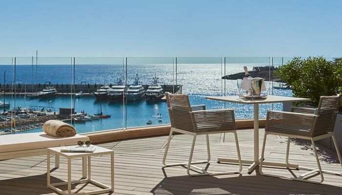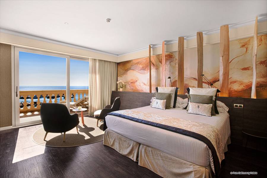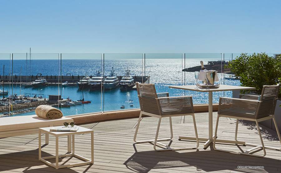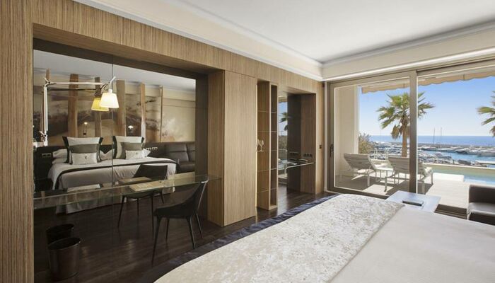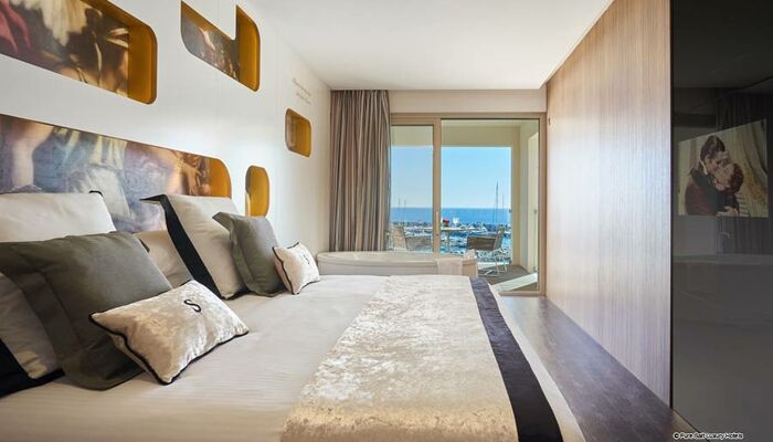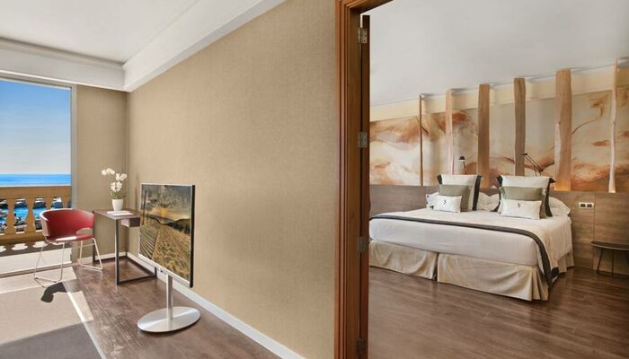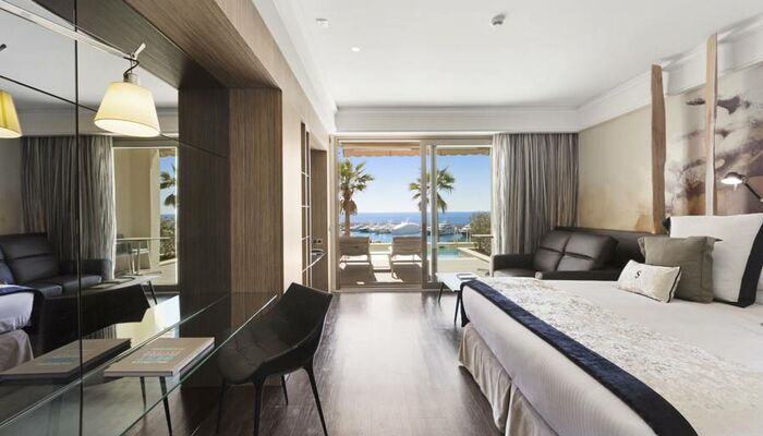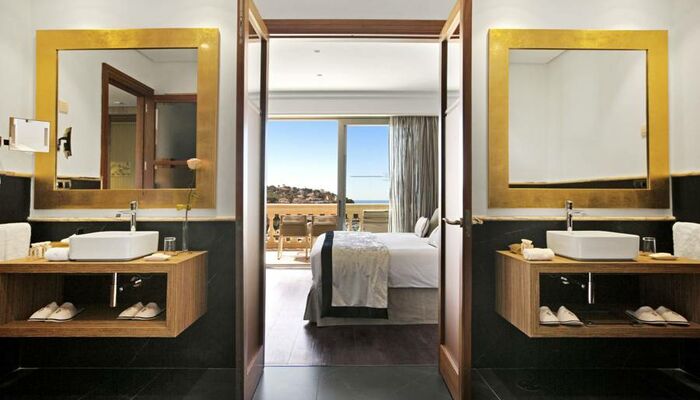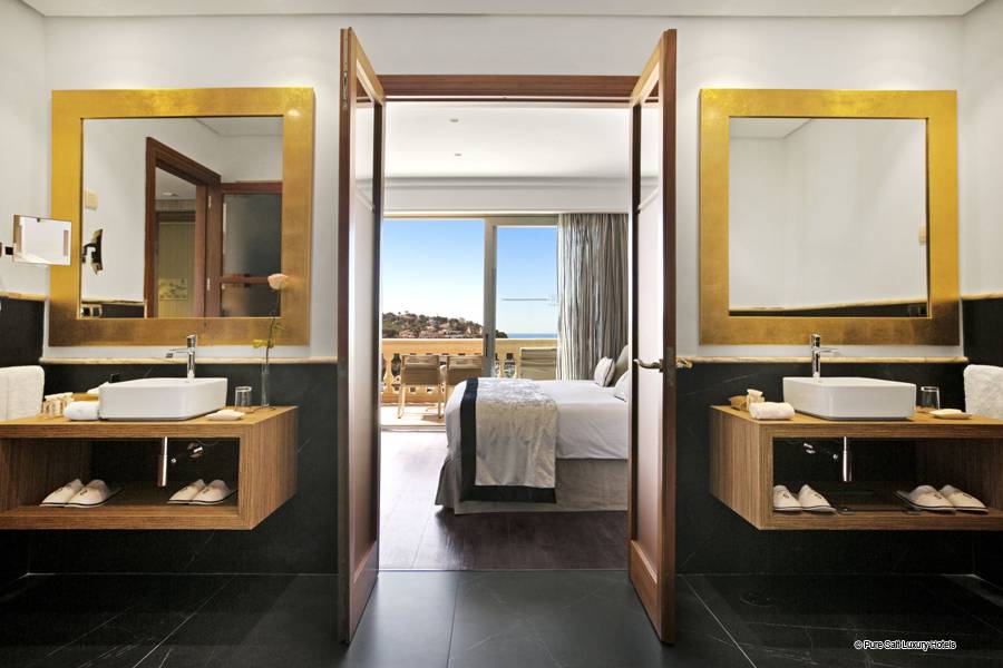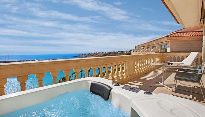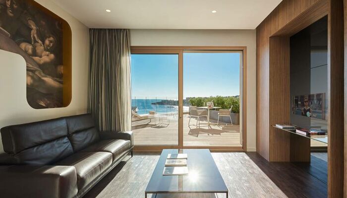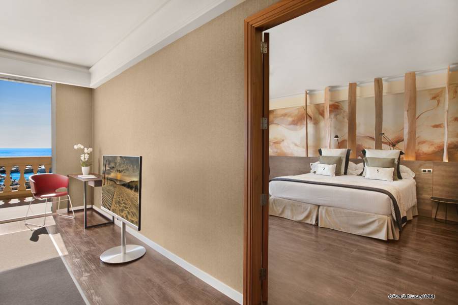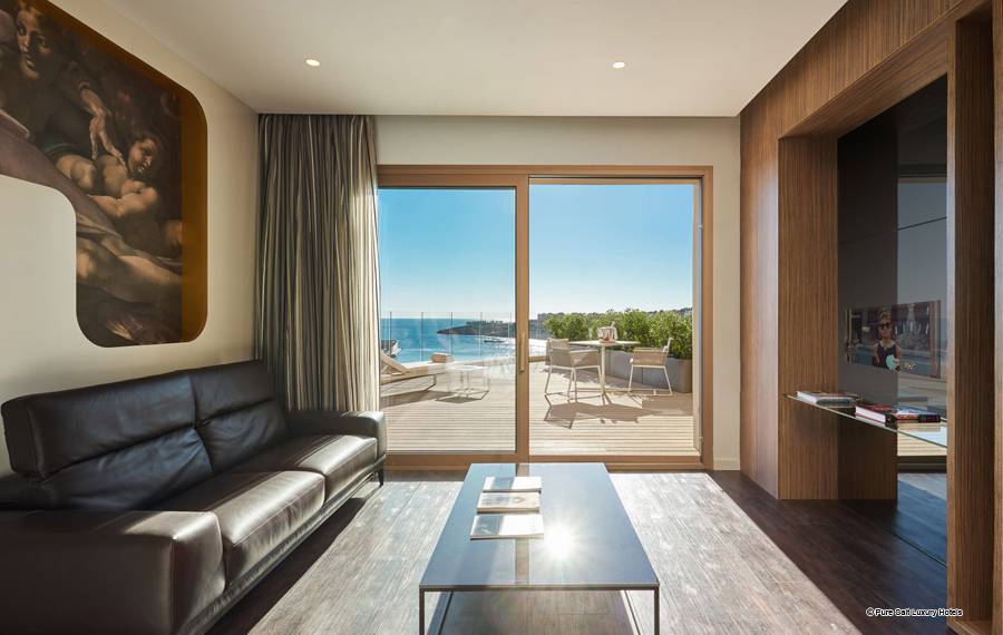 Suite Junior: Ces chambres sont élégamment décorées. Chacun dispose d'un coin salon spacieux avec télévision par satellite et canapé ainsi que d'un dressing pour plus de confort. L'hôtel dispose d'un total de onze suites junior, dont sept avec un jacuzzi relaxant dans la salle de bain, et seulement deux d'entre elles disposent d'un jacuzzi extérieur sur une grande terrasse privée donnant sur la mer Méditerranée.