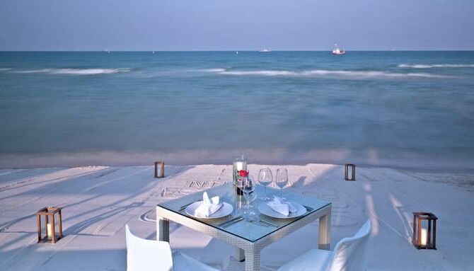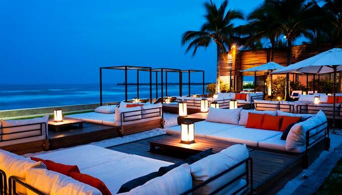 Au coucher du soleil, le club de plage illuminé par de nombreuses bougies en boîte de verre entre en action. Avec ses canapés surdimensionnés et ses coussins amples, le club est le lieu idéal pour se détendre et se détendre en sirotant une sélection de cocktails exotiques.
