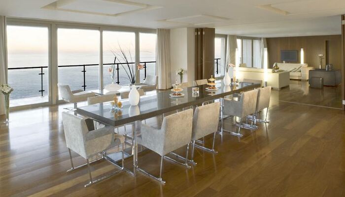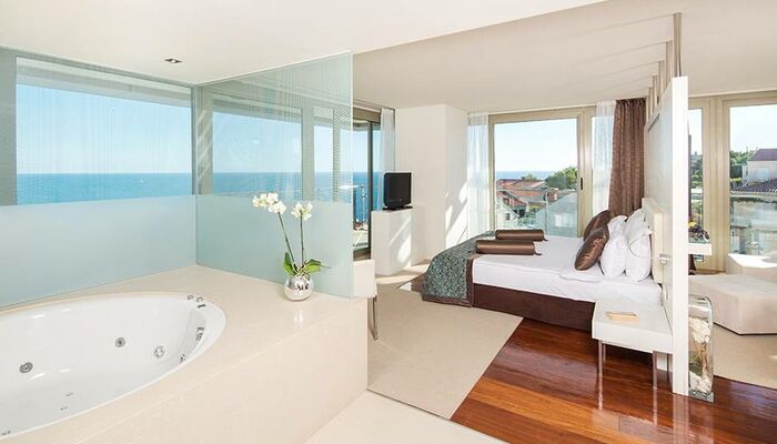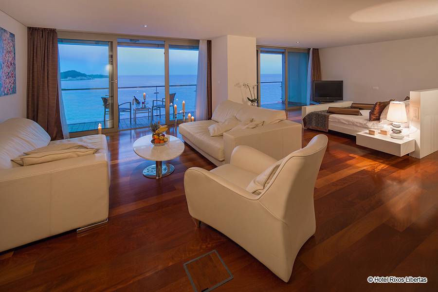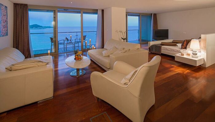 Notre suite présidentielle avec un espace de vie pratique réparti sur 180 m² comprenant une chambre à coucher, une salle à manger, une salle de réunion ainsi qu'une cuisine, un sauna finlandais et un jacuzzi séduit même les goûts les plus distingués. La suite présidentielle offre également une vue spectaculaire sur l'Adriatique depuis le grand balcon et transforme vos vacances en une expérience mémorable.