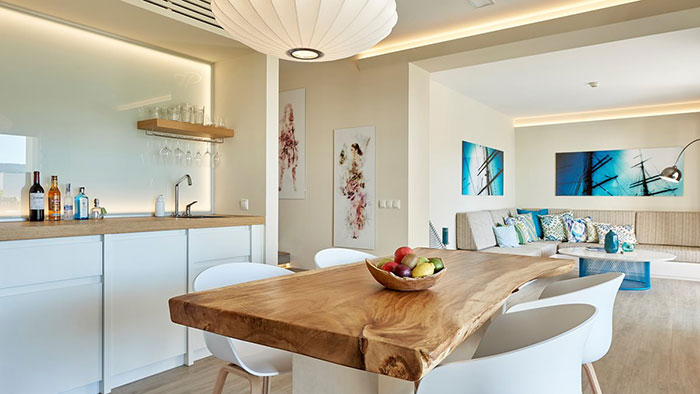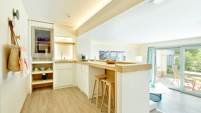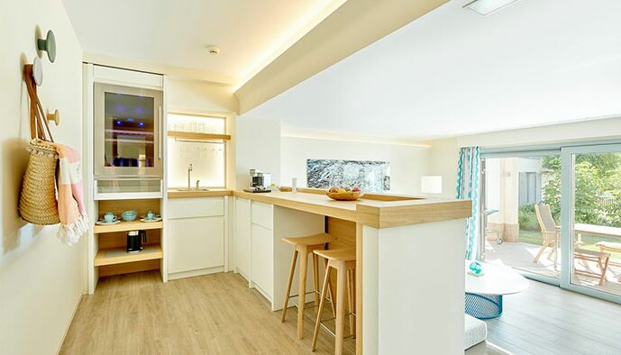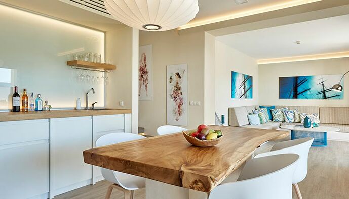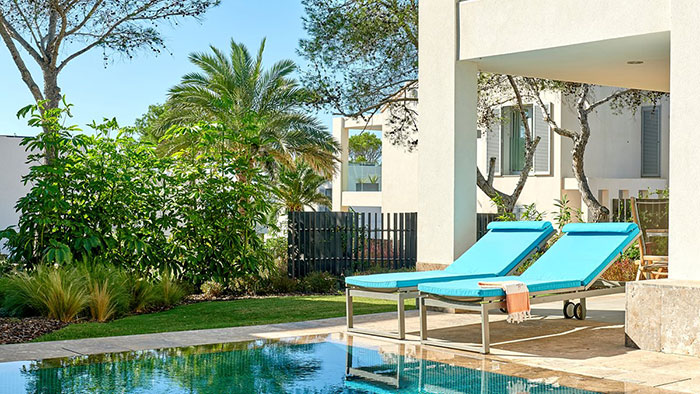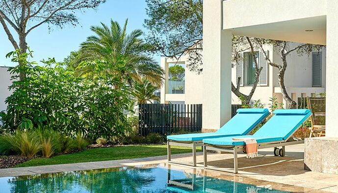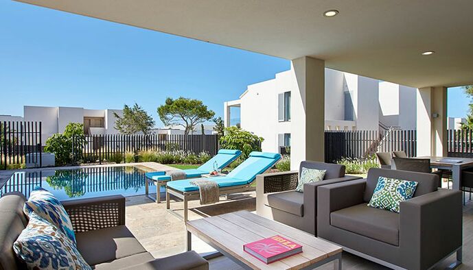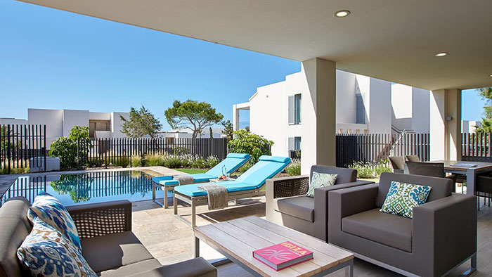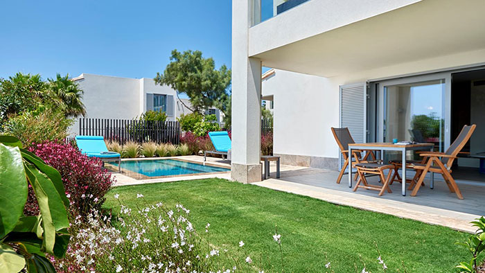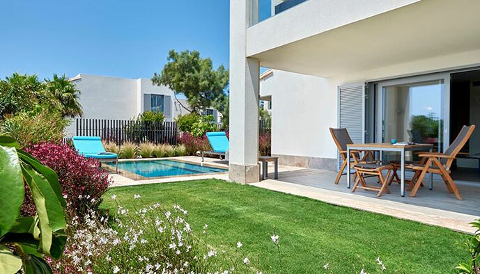 Une suite de luxe: Ouvrez votre porte et sautez dans votre propre piscine privée - parfait pour ceux qui cherchent à vraiment échapper à l‘agitation quotidienne. Ce luxueux complexe de style village d‘Ibiza propose 195 suites spacieuses d‘une ou deux chambres de 48 m² à 119 m². Les suites décloisonnées offrent une vue sur les jardins, les piscines de style lagon ou la mer Méditerranée depuis leurs terrasses et balcons privés.